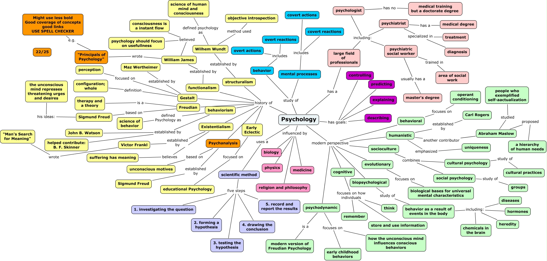 This Concept Map, created with IHMC CmapTools, has information related to: Michelle Brooks Ch 1 22, Psychology modern perspective behavioral, Psychology history of functionalism, Psychology uses a scientific method, scientific method five steps 1. investigating the question, Psychology history of Freudian, psychiatrist specialized in diagnosis, cognitive focuses on how individuals store and use information, Psychology history of Gestalt, Existentialism believes suffering has meaning, Psychology study of mental processes, socioculture combines social psychology, psychiatrist has a medical degree, Psychology study of behavior, behavior includes overt reactions, Psychology has a large field of professionals, psychiatric social worker trained in area of social work, Psychology influenced by physics, Sigmund Freud his ideas: the unconscious mind represses threatening urges and desires, humanistic established by Carl Rogers, Psychanalysis established by Sigmund Freud