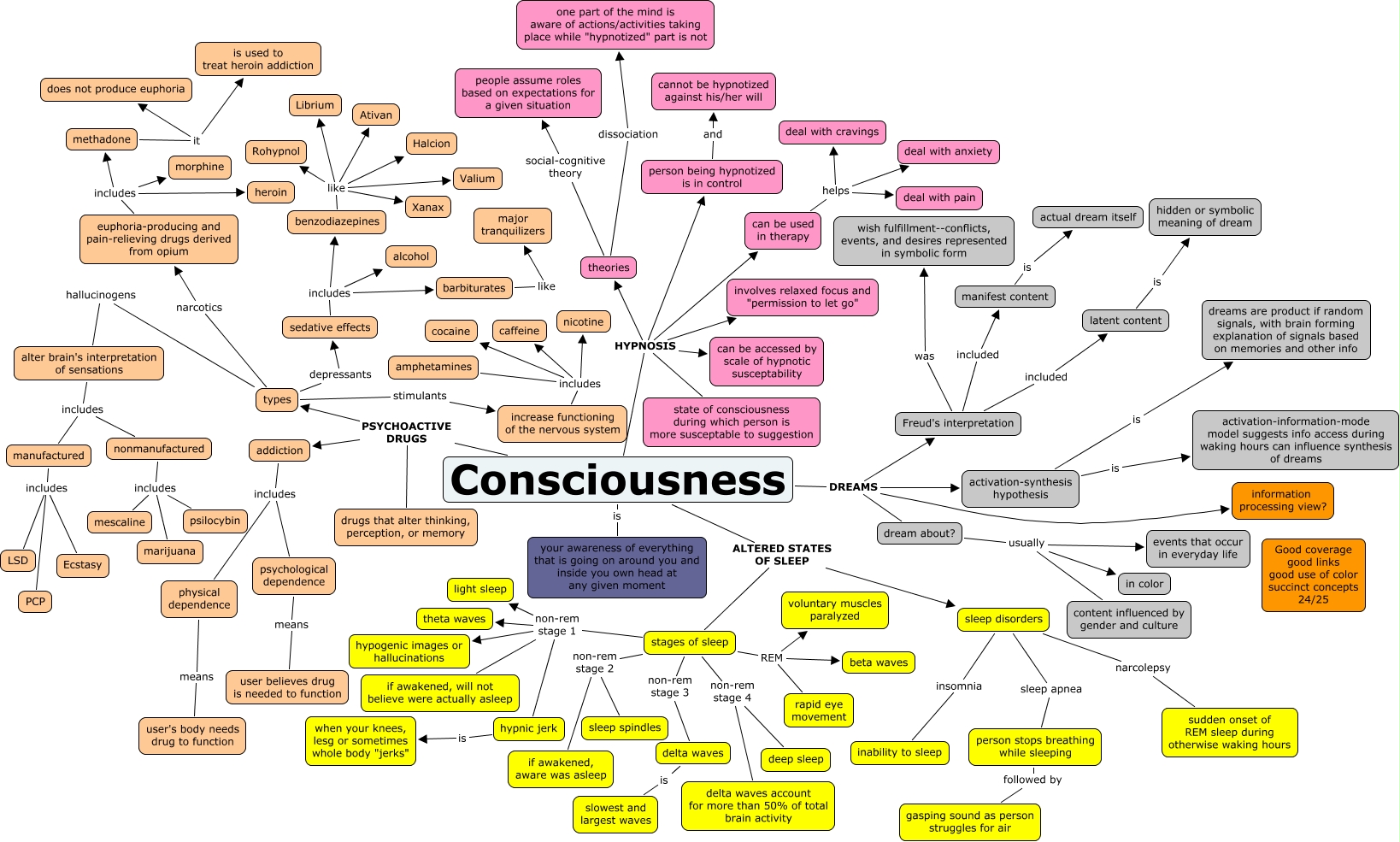 This Concept Map, created with IHMC CmapTools, has information related to: McNair Allissa Ch4 24, barbiturates like major tranquilizers, stages of sleep non-rem stage 2 if awakened, aware was asleep, Consciousness DREAMS information processing view?, Consciousness ALTERED STATES OF SLEEP stages of sleep, hypnic jerk is when your knees, lesg or sometimes whole body "jerks", person stops breathing while sleeping followed by gasping sound as person struggles for air, latent content is hidden or symbolic meaning of dream, stages of sleep REM rapid eye movement, theories social-cognitive theory people assume roles based on expectations for a given situation, manufactured includes PCP, benzodiazepines like Rohypnol, activation-synthesis hypothesis is activation-information-mode model suggests info access during waking hours can influence synthesis of dreams, Consciousness DREAMS Freud's interpretation, Freud's interpretation included manifest content, Consciousness is your awareness of everything that is going on around you and inside you own head at any given moment, Consciousness ALTERED STATES OF SLEEP sleep disorders, Consciousness HYPNOSIS can be used in therapy, methadone it does not produce euphoria, nonmanufactured includes mescaline, can be used in therapy helps deal with cravings