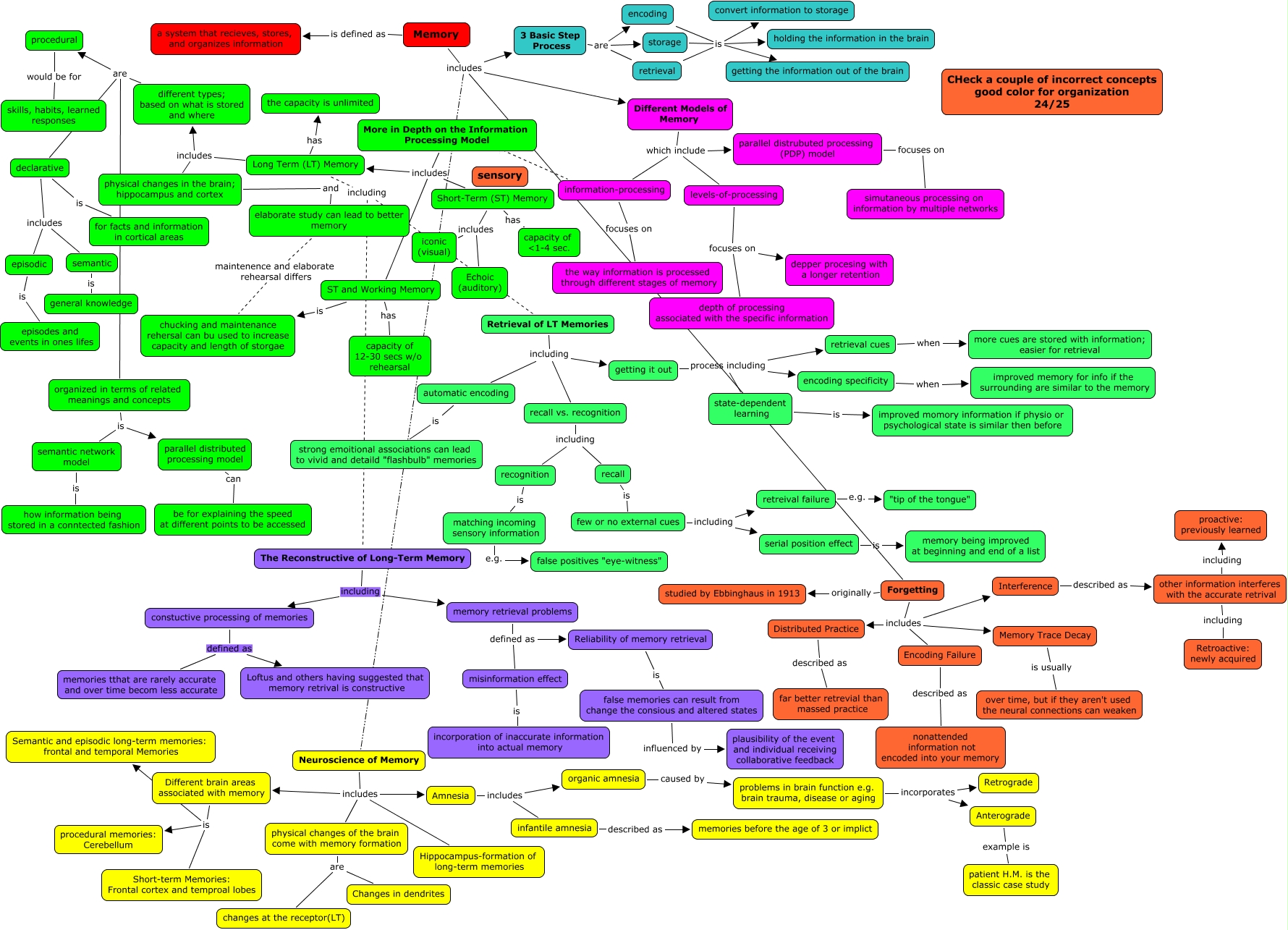This Concept Map, created with IHMC CmapTools, has information related to: Williams Chapter 6 24, physical changes of the brain come with memory formation are changes at the receptor(LT), false memories can result from change the consious and altered states influenced by plausibility of the event and individual receiving collaborative feedback, More in Depth on the Information Processing Model information-processing, problems in brain function e.g. brain trauma, disease or aging incorporates Retrograde, Forgetting includes Encoding Failure, Memory includes 3 Basic Step Process, 3 Basic Step Process are retrieval, Neuroscience of Memory includes physical changes of the brain come with memory formation, few or no external cues including retreival failure, recall is few or no external cues, semantic is general knowledge, different types; based on what is stored and where are declarative, The Reconstructive of Long-Term Memory including memory retrieval problems, other information interferes with the accurate retrival including Retroactive: newly acquired, Retrieval of LT Memories including automatic encoding, Memory is defined as a system that recieves, stores, and organizes information, semantic network model is how information being stored in a conntected fashion, ST and Working Memory is chucking and maintenance rehersal can bu used to increase capacity and length of storgae, ST and Working Memory has capacity of 12-30 secs w/o rehearsal, Long Term (LT) Memory has the capacity is unlimited