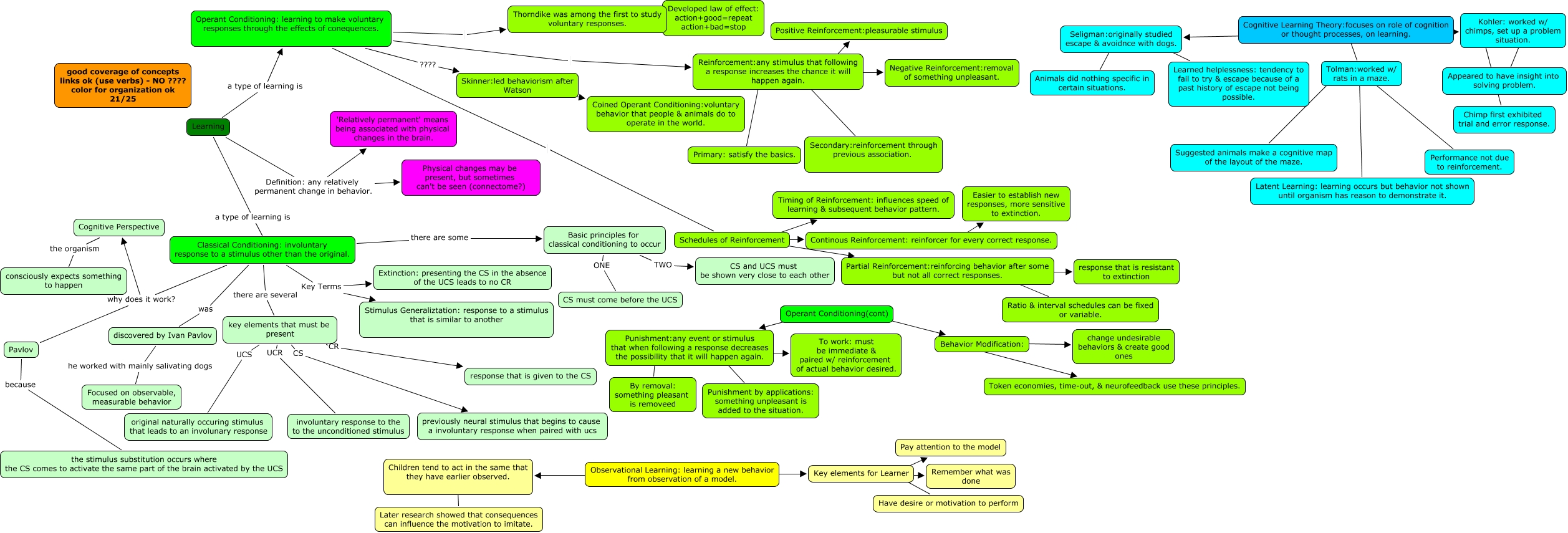 This Concept Map, created with IHMC CmapTools, has information related to: Kaitlyn ch 5 22, Cognitive Learning Theory:focuses on role of cognition or thought processes, on learning. ???? Seligman:originally studied escape & avoidnce with dogs., Reinforcement:any stimulus that following a response increases the chance it will happen again. ???? Negative Reinforcement:removal of something unpleasant., Schedules of Reinforcement ???? Continous Reinforcement: reinforcer for every correct response., Classical Conditioning: involuntary response to a stimulus other than the original. why does it work? Pavlov, Operant Conditioning: learning to make voluntary responses through the effects of conequences. Thorndike was among the first to study voluntary responses., Punishment:any event or stimulus that when following a response decreases the possibility that it will happen again. ???? To work: must be immediate & paired w/ reinforcement of actual behavior desired., Key elements for Learner ???? Pay attention to the model, key elements that must be present CR response that is given to the CS, Pavlov because the stimulus substitution occurs where the CS comes to activate the same part of the brain activated by the UCS, Punishment:any event or stimulus that when following a response decreases the possibility that it will happen again. ???? Punishment by applications: something unpleasant is added to the situation., Tolman:worked w/ rats in a maze. ???? Latent Learning: learning occurs but behavior not shown until organism has reason to demonstrate it., Seligman:originally studied escape & avoidnce with dogs. ???? Animals did nothing specific in certain situations., Behavior Modification: ???? change undesirable behaviors & create good ones, Classical Conditioning: involuntary response to a stimulus other than the original. there are some Basic principles for classical conditioning to occur, Reinforcement:any stimulus that following a response increases the chance it will happen again. ???? Primary: satisfy the basics., Thorndike was among the first to study voluntary responses. ???? Developed law of effect: action+good=repeat action+bad=stop, Classical Conditioning: involuntary response to a stimulus other than the original. was discovered by Ivan Pavlov, key elements that must be present UCR involuntary response to the to the unconditioned stimulus, Learning Definition: any relatively permanent change in behavior. Physical changes may be present, but sometimes can't be seen (connectome?), Reinforcement:any stimulus that following a response increases the chance it will happen again. ???? Secondary:reinforcement through previous association.