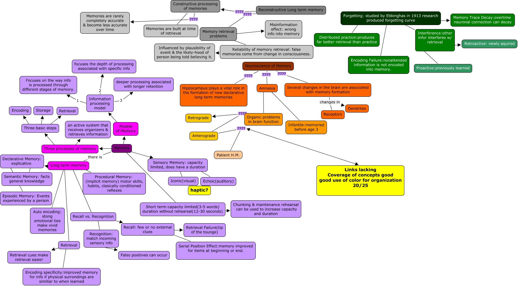 This Concept Map, created with IHMC CmapTools, has information related to: Kaitlyn Johnson ch 6 20, Recognition: match incoming sensory info ???? Falso positives can occur, Organic:problems in brain function ???? Anterograde, Forgetting: studied by Ebbinghas in 1913 research produced forgetting curve ???? Memory Trace Decay:overtime neuronal connection can decay, Neuroscience of Memory ???? Hippocampus:plays a vital role in the formation of new declarative long term memories, Retrieval ???? Retrieval cues:make retrieval easier, Interference:other infor interferes w/ retrieval ???? Proactive:previously learned, Declarative Memory: explicative ???? Semantic Memory: facts general knowledge, Short term:capacity limited(3-5 words) duration without rehearsal(12-30 seconds) ???? Chunking & maintenance rehearsal can be used to increase capacity and duration, Reconstructive Long term memory ???? Memory retrieval problems, Interference:other infor interferes w/ retrieval ???? Retroactive: newly aquired, Organic:problems in brain function ???? Retrograde, Long term memory ???? Auto encoding: stong emotional ties make vivid memories, Long term memory ???? Procedural Memory: (implicit memory) motor skills, habits, clasically conditioned reflexes, Memory retrieval problems ???? Reliability of memory retrieval: false memories come from change in consciousness., Constructive processing of memories ???? Memories are built at time of retrieval, Forgetting: studied by Ebbinghas in 1913 research produced forgetting curve ???? Encoding Failure:nonattended information is not encoded into memory., Recall vs. Recognition ???? Recall: few or no external clues, Amnesia ???? Organic:problems in brain function, Anterograde ???? Patient H.M., Constructive processing of memories ???? Memories are rarely completely accurate & become less accurate over time