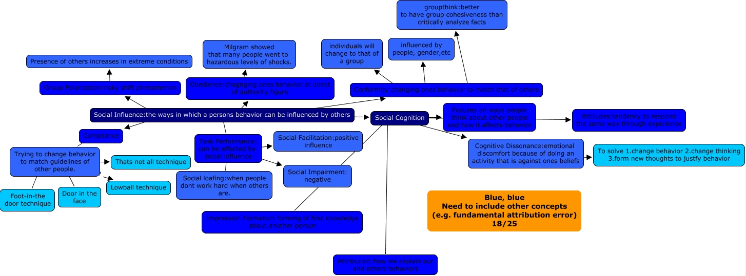 This Concept Map, created with IHMC CmapTools, has information related to: Kaitlyn Johnson ch 12 18, Social Influence:the ways in which a persons behavior can be influenced by others ???? Compliance, Social Cognition ???? Focuses on ways people think about other people and how it affects behavior, Social Cognition ???? Attitudes:tendency to respond the same way through experience, Group Polarization:risky shift phenomenon ???? Presence of others increases in extreme conditions, Task Performance: can be affected by social influence ???? Social Impairment: negative, Social Influence:the ways in which a persons behavior can be influenced by others ???? Conformity:changing ones behavior to match that of others, Trying to change behavior to match guidelines of other people. ???? Foot-in-the door technique, Social Influence:the ways in which a persons behavior can be influenced by others ???? Group Polarization:risky shift phenomenon, Obedience:chagnging ones behavior at direct of authority figure ???? Milgram showed that many people went to hazardous levels of shocks., Conformity:changing ones behavior to match that of others ???? individuals will change to that of a group, Conformity:changing ones behavior to match that of others ???? groupthink:better to have group cohesiveness than critically analyze facts, Trying to change behavior to match guidelines of other people. ???? Thats not all technique, Social Cognition ???? Attribution:how we explain our and others behaviors, Social Influence:the ways in which a persons behavior can be influenced by others ???? Obedience:chagnging ones behavior at direct of authority figure, Compliance ???? Trying to change behavior to match guidelines of other people., Social Influence:the ways in which a persons behavior can be influenced by others ???? Task Performance: can be affected by social influence, Trying to change behavior to match guidelines of other people. ???? Lowball technique, Conformity:changing ones behavior to match that of others ???? influenced by people, gender,etc, Social Cognition ???? Impression Formation:forming of first knowledge about another person, Trying to change behavior to match guidelines of other people. ???? Door in the face