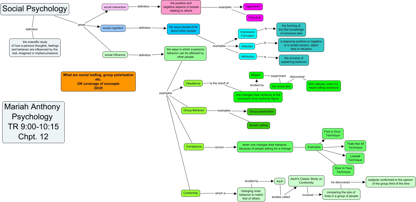 This Concept Map, created with IHMC CmapTools, has information related to: Anthony Ch.12 25, Compliance occurs when one changes their behavior because of people asking for a change, Social Psychology areas social influence, Conformity which is changing ones behavior to match that of others, Social Psychology definition the scientific study of how a persons thoughts, feelings and behavior are influenced by the real, imagined or implied presence, Asch's Classic Study on Conformity involved comparing the size of lines in a group of people, social interaction definition the positive and negative aspects of people relating to others, Social Psychology areas social cognition, Attitudes is a response positive or negative to a certain person, object idea or situation, Examples ???? Foot in Door Technique, the ways people think about other people examples Impression Formation, Group Behavior examples Group polarization, Milgrim experiment the shock test, when one changes their behavior because of people asking for a change Examples Examples, the shock test discovered 65% obeyed, even if it meant killing someone, Examples ???? Thats Not All Technique, the ways in which a persons behavior can be affected by other people examples Obedience, the ways in which a persons behavior can be affected by other people examples Conformity, the ways people think about other people examples Attribution, Examples ???? Door in Face Technique, Impression Formation is the forming of the first knowledge of someone else