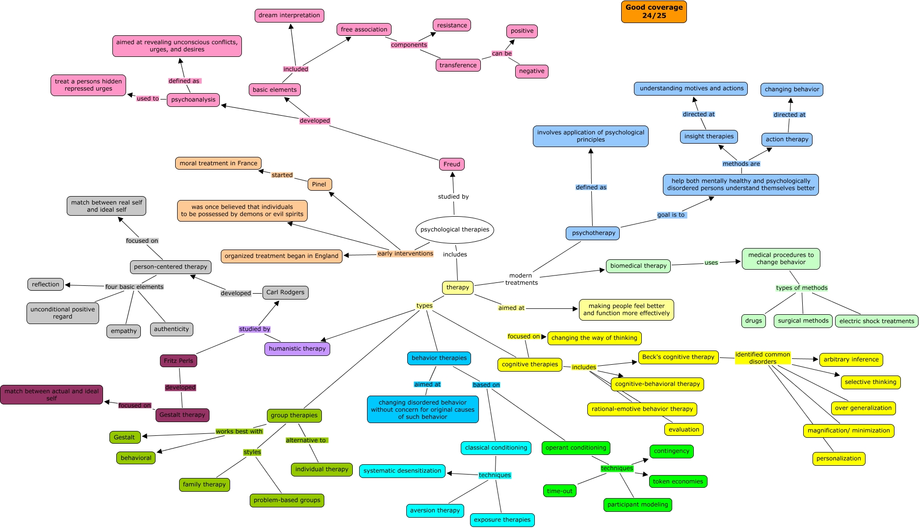 This Concept Map, created with IHMC CmapTools, has information related to: Bishop Ch 15 24, transference can be negative, behavior therapies types humanistic therapy, psychoanalysis defined as aimed at revealing unconscious conflicts, urges, and desires, basic elements included dream interpretation, Freud developed psychoanalysis, medical procedures to change behavior types of methods drugs, Gestalt therapy focused on match between actual and ideal self, behavior therapies based on operant conditioning, basic elements included free association, psychotherapy goal is to help both mentally healthy and psychologically disordered persons understand themselves better, therapy modern treatments biomedical therapy, classical conditioning techniques exposure therapies, behavior therapies based on classical conditioning, behavior therapies types group therapies, psychoanalysis used to treat a persons hidden repressed urges, Beck's cognitive therapy identified common disorders personalization, person-centered therapy four basic elements empathy, free association components transference, Fritz Perls developed Gestalt therapy, operant conditioning techniques time-out