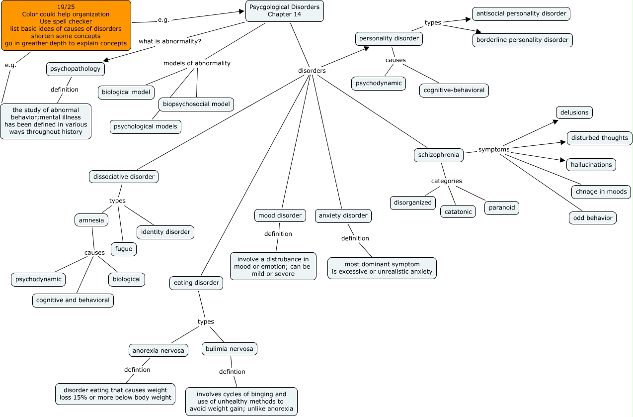 This Concept Map, created with IHMC CmapTools, has information related to: Olivia Dixon Ch 14 19, schizophrenia symptoms delusions, dissociative disorder types identity disorder, 19/25 Color could help organization Use spell checker list basic ideas of causes of disorders shorten some concepts go in greather depth to explain concepts e.g. Psycgological Disorders Chapter 14, 19/25 Color could help organization Use spell checker list basic ideas of causes of disorders shorten some concepts go in greather depth to explain concepts e.g. the study of abnormal behavior;mental illness has been defined in various ways throughout history, personality disorder causes psychodynamic, bulimia nervosa defintion involves cycles of binging and use of unhealthy methods to avoid weight gain; unlike anorexia, Psycgological Disorders Chapter 14 disorders personality disorder, Psycgological Disorders Chapter 14 what is abnormality? psychopathology, mood disorder definition involve a distrubance in mood or emotion; can be mild or severe, personality disorder types antisocial personality disorder, personality disorder causes cognitive-behavioral, Psycgological Disorders Chapter 14 disorders schizophrenia, anxiety disorder definition most dominant symptom is excessive or unrealistic anxiety, eating disorder types anorexia nervosa, Psycgological Disorders Chapter 14 models of abnormality biological model, dissociative disorder types amnesia, Psycgological Disorders Chapter 14 disorders dissociative disorder, anorexia nervosa defintion disorder eating that causes weight loss 15% or more below body weight, personality disorder types borderline personality disorder, dissociative disorder types fugue