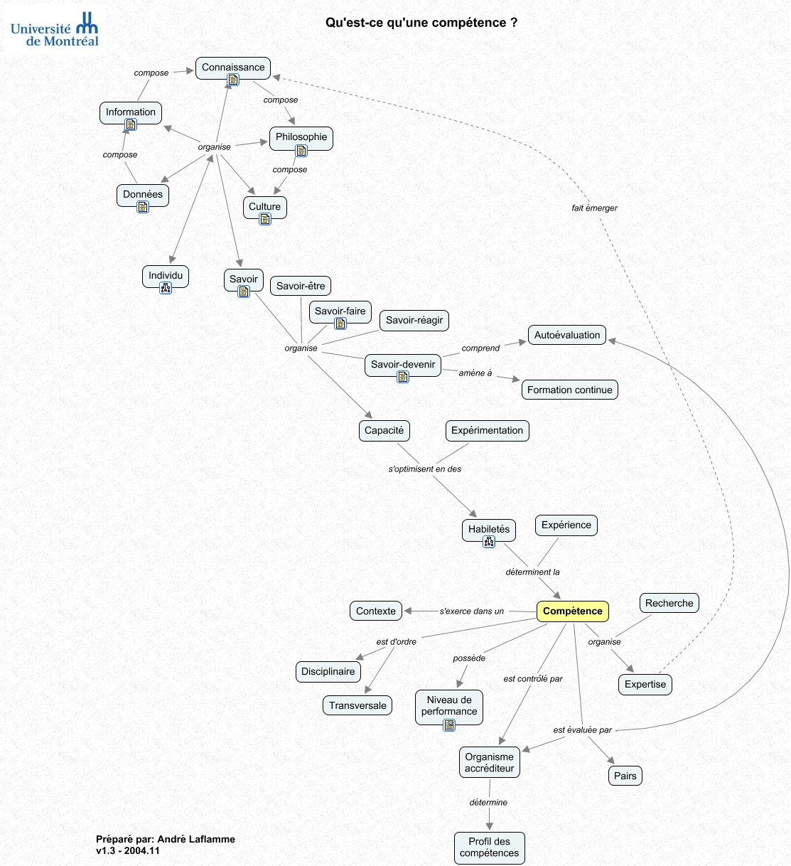 Cette carte de concepts créée avec IHMC CmapTools traite de: Competence, Compétence est d'ordre Transversale, Compétence possède Niveau de performance, Compétence est contrôlé par Organisme accréditeur, Compétence est d'ordre Disciplinaire, Individu organise Information, Individu organise Connaissance, Recherche organise Expertise, Savoir-devenir organise Capacité, Compétence est évaluée par Pairs, Compétence est évaluée par Organisme accréditeur, Savoir organise Capacité, Expérimentation s'optimisent en des Habiletés, Expérience déterminent la Compétence, Connaissance compose Philosophie, Individu organise Culture, Philosophie compose Culture, Savoir-être organise Capacité, Savoir-réagir organise Capacité, Organisme accréditeur détermine Profil des compétences, Individu organise Savoir