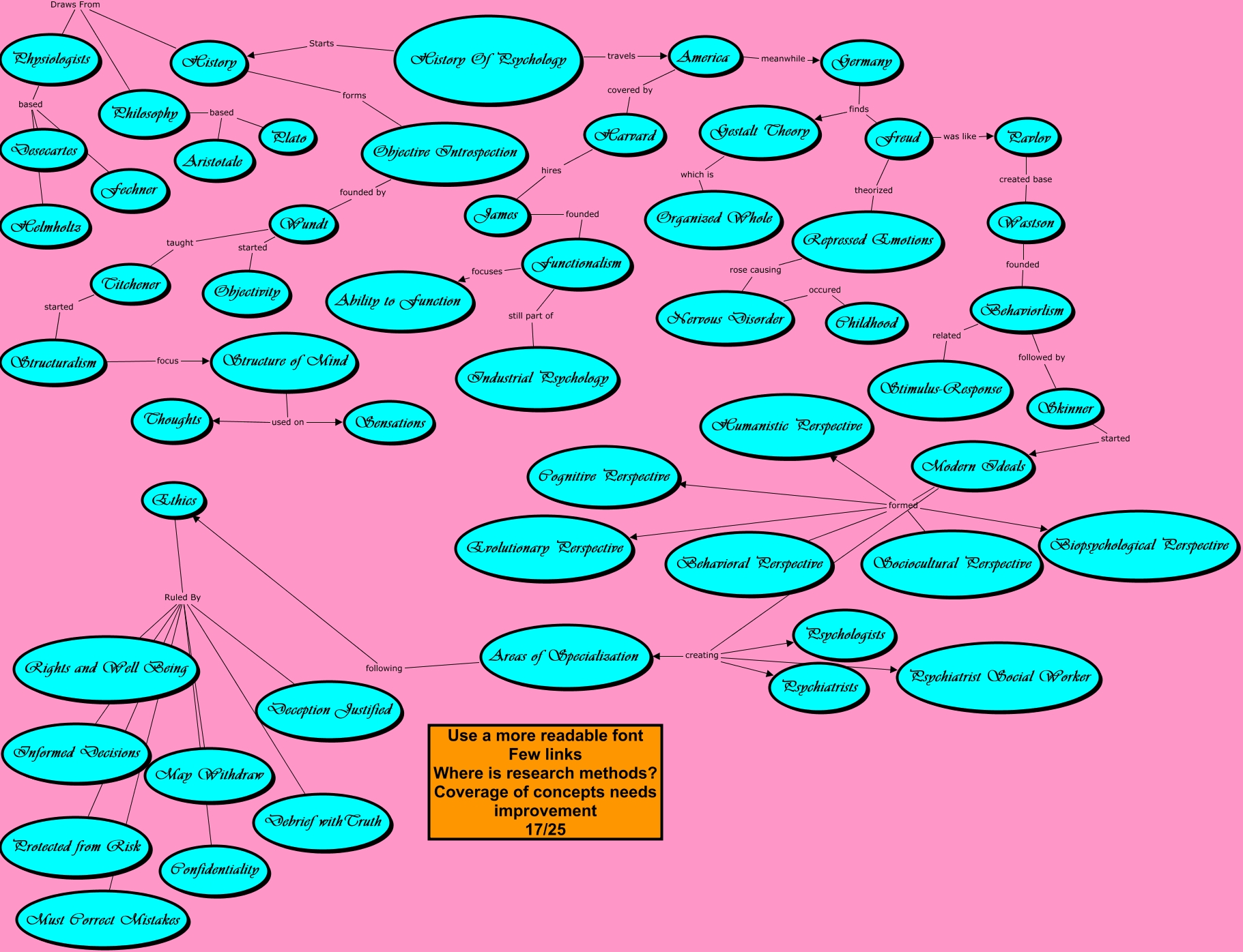 This Concept Map, created with IHMC CmapTools, has information related to: Crosby Ch.1 17, Ethics Ruled By Protected from Risk, Gestalt Theory which is Organized Whole, Ethics Ruled By Debrief withTruth, Physiologists based Fechner, Modern Ideals formed Biopsychological Perspective, Objective Introspection founded by Wundt, Modern Ideals creating Psychiatrist Social Worker, Harvard hires James, Wundt taught Titchener, Ethics Ruled By Confidentiality, Functionalism still part of Industrial Psychology, History Draws From Physiologists, Skinner started Modern Ideals, Titchener started Structuralism, Modern Ideals formed Sociocultural Perspective, Behaviorlism related Stimulus-Response, Functionalism focuses Ability to Function, Modern Ideals formed Behavioral Perspective, Structuralism focus Structure of Mind, America meanwhile Germany