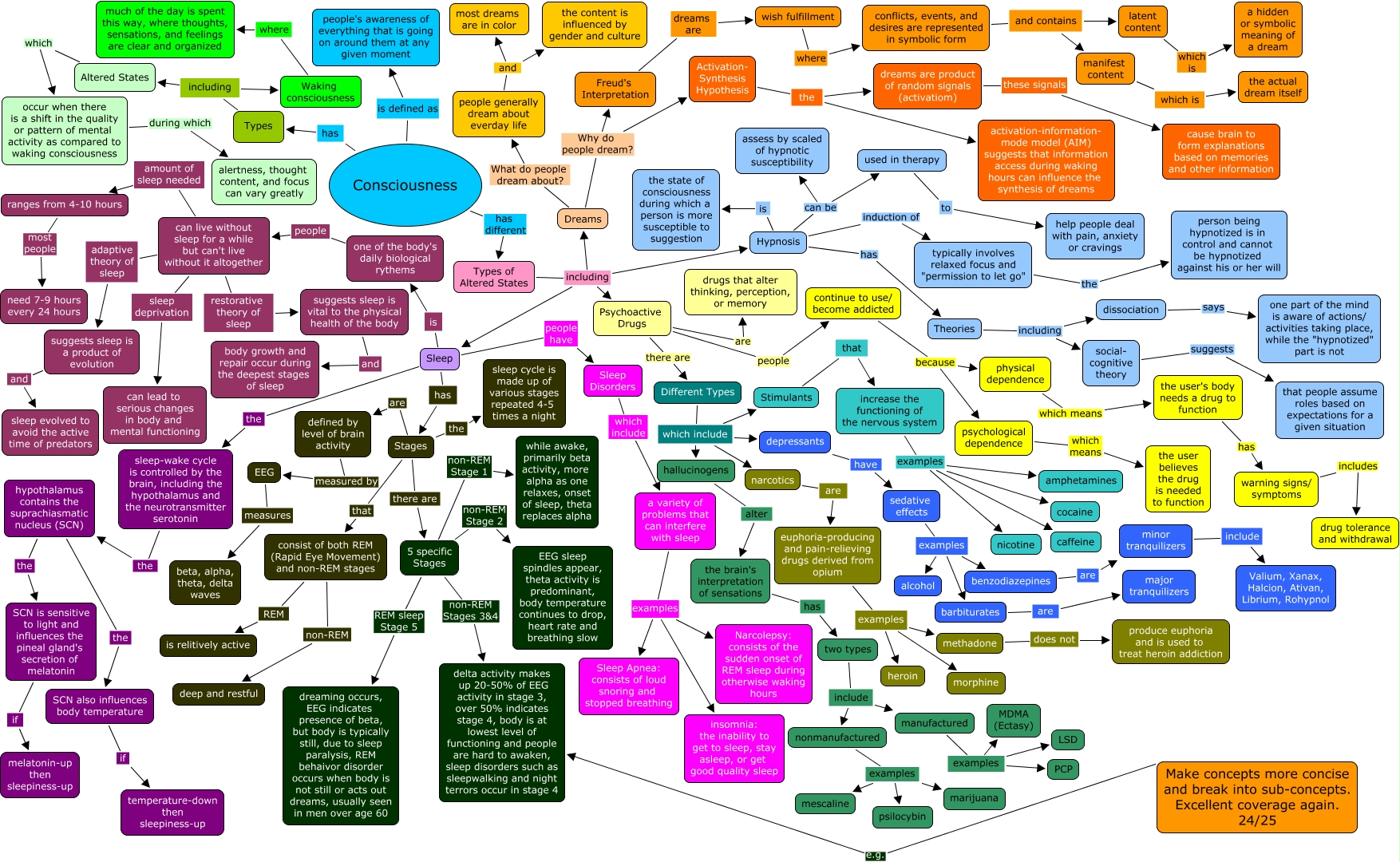This Concept Map, created with IHMC CmapTools, has information related to: Kamri Colvin-Reece ch4 24, SCN also influences body temperature if temperature-down then sleepiness-up, can live without sleep for a while but can't live without it altogether adaptive theory of sleep suggests sleep is a product of evolution, typically involves relaxed focus and "permission to let go" the person being hypnotized is in control and cannot be hypnotized against his or her will, hypothalamus contains the suprachiasmatic nucleus (SCN) the SCN also influences body temperature, dissociation says one part of the mind is aware of actions/ activities taking place, while the "hypnotized" part is not, 5 specific Stages non-REM Stage 1 while awake, primarily beta activity, more alpha as one relaxes, onset of sleep, theta replaces alpha, Consciousness has Types, conflicts, events, and desires are represented in symbolic form and contains manifest content, Different Types which include Stimulants, people generally dream about everday life and most dreams are in color, a variety of problems that can interfere with sleep examples Narcolepsy: consists of the sudden onset of REM sleep during otherwise waking hours, benzodiazepines are minor tranquilizers, warning signs/ symptoms includes drug tolerance and withdrawal, nonmanufactured examples mescaline, two types include manufactured, Psychoactive Drugs are drugs that alter thinking, perception, or memory, Hypnosis is the state of consciousness during which a person is more susceptible to suggestion, physical dependence which means the user's body needs a drug to function, Theories including social- cognitive theory, sedative effects examples benzodiazepines