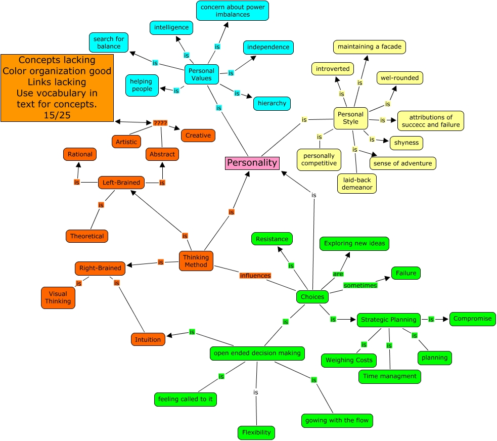 This Concept Map, created with IHMC CmapTools, has information related to: Chase Simpson CH.4 15, Abstract ???? Creative, Strategic Planning is Time managment, Personal Values is independence, Choices sometimes Failure, Choices is open ended decision making, Left-Brained is Abstract, open ended decision making is gowing with the flow, Personal Values is Personality, Choices is Strategic Planning, Personal Values is helping people, Personal Style is sense of adventure, open ended decision making is Flexibility, open ended decision making is feeling called to it, Choices are Exploring new ideas, Personal Values is search for balance, Left-Brained is Theoretical, Abstract ???? Artistic, Personal Style is Personality, Thinking Method is Right-Brained, Personal Values is intelligence