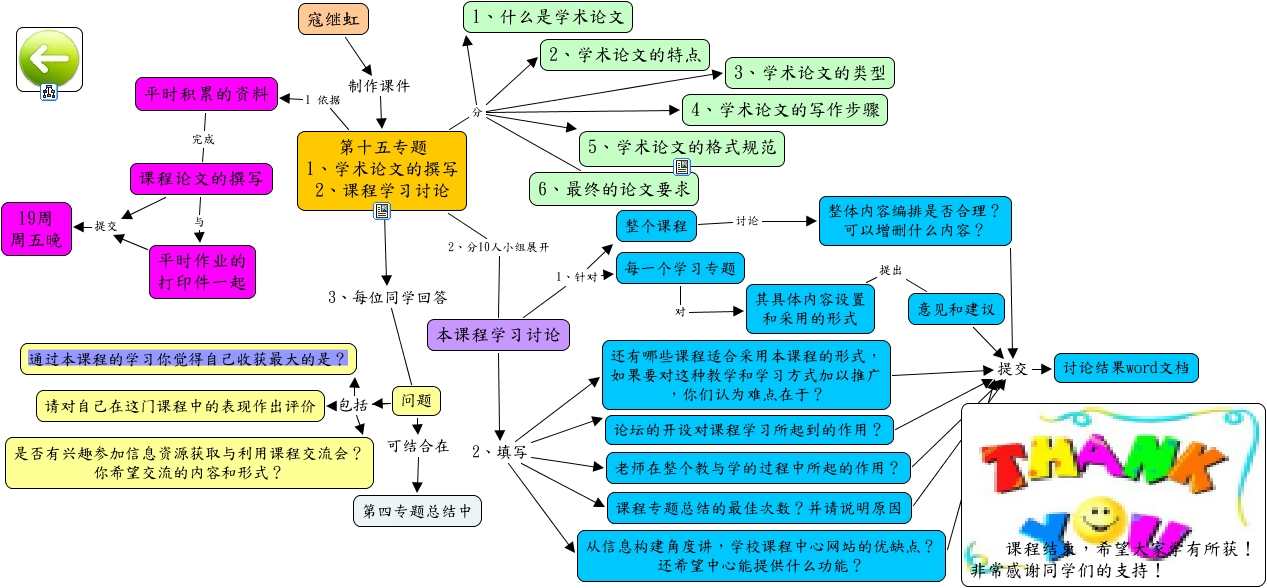 此概念图以 IHMC CmapTools 创建, 内含信息有关于: 第十五专题 课程讨论, 老师在整个教与学的过程中所起的作用? 提交 讨论结果word文档, 第十五专题 1、学术论文的撰写 2、课程学习讨论 分 5、学术论文的格式规范, 问题 包括 是否有兴趣参加信息资源获取与利用课程交流会? 你希望交流的内容和形式?, 意见和建议 提交 讨论结果word文档, 第十五专题 1、学术论文的撰写 2、课程学习讨论 分 6、最终的论文要求, 第十五专题 1、学术论文的撰写 2、课程学习讨论 3、每位同学回答 问题, 其具体内容设置 和采用的形式 提出 意见和建议, 课程论文的撰写 与 平时作业的 打印件一起, 第十五专题 1、学术论文的撰写 2、课程学习讨论 分 3、学术论文的类型, 第十五专题 1、学术论文的撰写 2、课程学习讨论 分 1、什么是学术论文, 问题 可结合在 第四专题总结中, 第十五专题 1、学术论文的撰写 2、课程学习讨论 分 2、学术论文的特点, 第十五专题 1、学术论文的撰写 2、课程学习讨论 1 依据 平时积累的资料, 课程专题总结的最佳次数?并请说明原因 提交 讨论结果word文档, 本课程学习讨论 2、填写 课程专题总结的最佳次数?并请说明原因, 本课程学习讨论 1、针对 每一个学习专题, 寇继虹 制作课件 第十五专题 1、学术论文的撰写 2、课程学习讨论, 问题 包括 通过本课程的学习你觉得自己收获最大的是?, 问题 包括 通过本课程的学习你觉得自己收获最大的是?, 还有哪些课程适合采用本课程的形式, 如果要对这种教学和学习方式加以推广 ,你们认为难点在于? 提交 讨论结果word文档