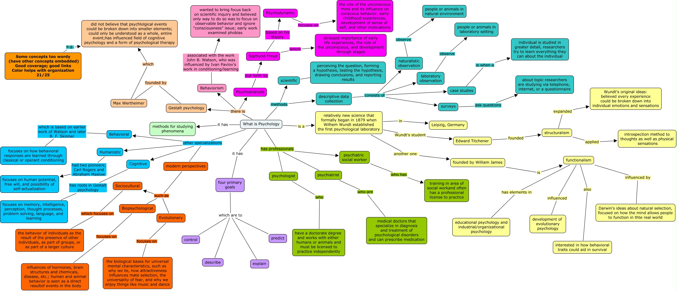 This Concept Map, created with IHMC CmapTools, has information related to: Edwards ch.1 21, What is Psychology it has methods for studying phenomena, surveys ask questions about topic researchers are studying via telephone, internet, or a questionnaire, Sigmund Freud based on his theory Psychodynamic, Psychodynamic focuses on the role of the unconscious mind and its influence on conscious behavior, early childhood experiences, development of sense of self, and other motivations, What is Psychology has professionals psychiatric social worker, What is Psychology other specializations Humanistic, functionalism also interested in how behavioral traits could aid in survival, What is Psychology other specializations Cognitive, Edward Titchener founded structuralism, modern perspectives such as Evolutionary, laboratory observation observe people or animals in laboratory setting, What is Psychology there is Behaviorism, What is Psychology there is Gestalt psychology, relatively new science that formally began in 1879 when Wilhem Wundt established the first psychological laboratory Wundt's student Edward Titchener, What is Psychology other specializations modern perspectives, four primary goals which are to describe, descriptive data collection consists of surveys, What is Psychology has professionals psychiatrist, four primary goals which are to control, naturalistic observation observe people or animals in natural environment