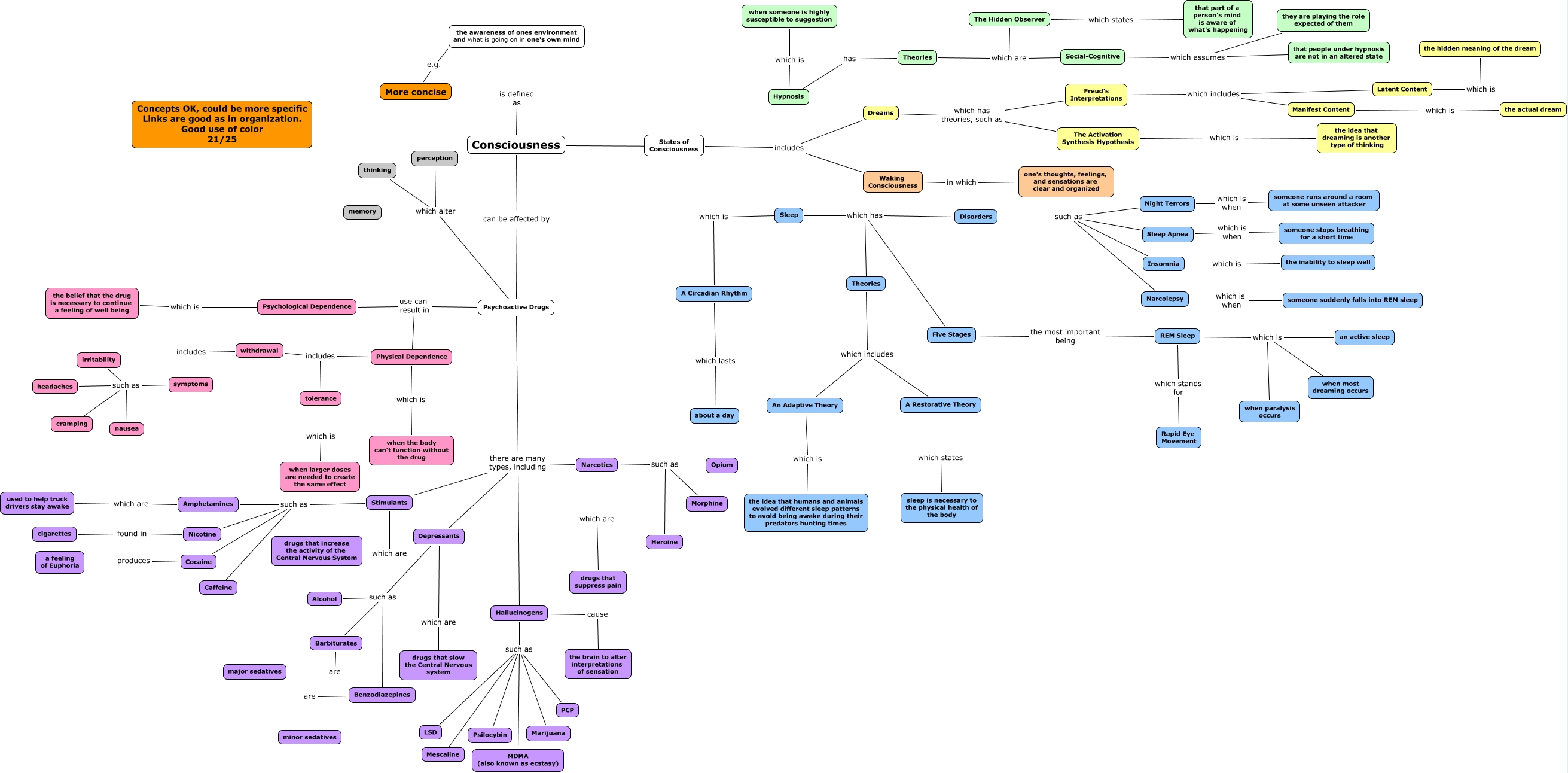 This Concept Map, created with IHMC CmapTools, has information related to: Diamond Ch 4 21, REM Sleep which is when paralysis occurs, Social-Cognitive which assumes that people under hypnosis are not in an altered state, An Adaptive Theory which is the idea that humans and animals evolved different sleep patterns to avoid being awake during their predators hunting times, REM Sleep which is an active sleep, Depressants such as Alcohol, Five Stages the most important being REM Sleep, Social-Cognitive which assumes they are playing the role expected of them, Sleep Apnea which is when someone stops breathing for a short time, Physical Dependence includes tolerance, Latent Content which is the hidden meaning of the dream, Psychoactive Drugs use can result in Psychological Dependence, Benzodiazepines are minor sedatives, Narcotics which are drugs that suppress pain, Night Terrors which is when someone runs around a room at some unseen attacker, Physical Dependence includes withdrawal, Consciousness States of Consciousness, Depressants which are drugs that slow the Central Nervous system, Psychoactive Drugs which alter thinking, Psychological Dependence which is the belief that the drug is necessary to continue a feeling of well being, Consciousness can be affected by Psychoactive Drugs