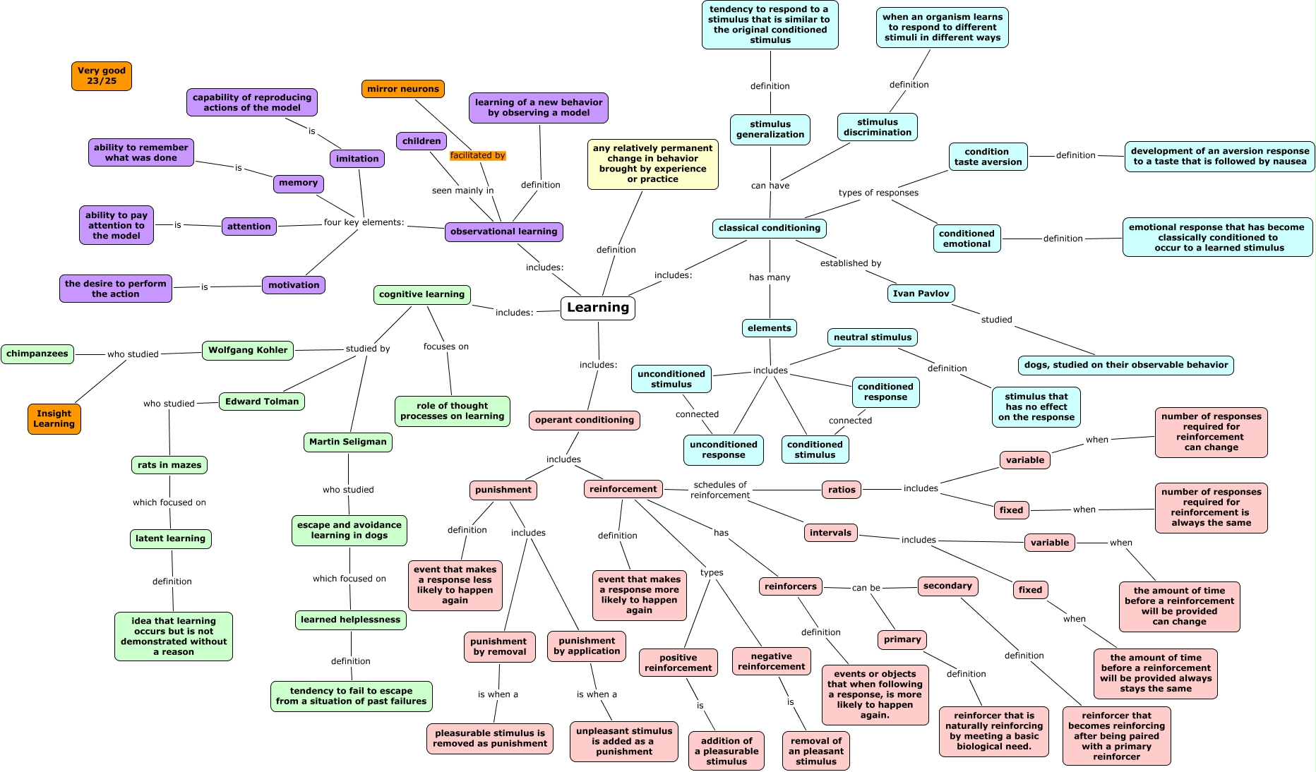 This Concept Map, created with IHMC CmapTools, has information related to: Brooks Ch 5 23, elements includes conditioned stimulus, stimulus discrimination definition when an organism learns to respond to different stimuli in different ways, classical conditioning types of responses conditioned emotional, Edward Tolman who studied rats in mazes, operant conditioning includes punishment, Martin Seligman who studied escape and avoidance learning in dogs, punishment by removal is when a pleasurable stimulus is removed as punishment, Learning definition any relatively permanent change in behavior brought by experience or practice, classical conditioning has many elements, cognitive learning focuses on role of thought processes on learning, imitation is capability of reproducing actions of the model, classical conditioning types of responses condition taste aversion, reinforcers can be primary, fixed when the amount of time before a reinforcement will be provided always stays the same, stimulus generalization definition tendency to respond to a stimulus that is similar to the original conditioned stimulus, primary definition reinforcer that is naturally reinforcing by meeting a basic biological need., elements includes unconditioned response, intervals includes variable, punishment definition event that makes a response less likely to happen again, reinforcement types negative reinforcement
