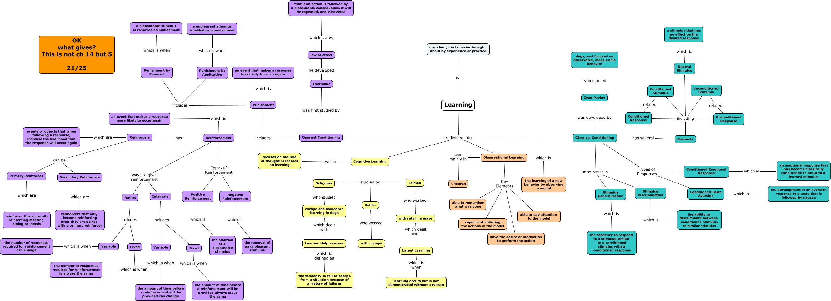 This Concept Map, created with IHMC CmapTools, has information related to: Diamond Ch 14 21, Conditioned Response related Conditioned Stimulus, Elements including Conditioned Stimulus, Reinforcers can be Secondary Reinforcers, Unconditioned Stimulus related Unconditioned Response, Reinforcement Types of Reinforcement Positive Reinforcement, Kohler who worked with chimps, Reinforcers can be Primary Reinforces, Classical Conditioning may result in Stimulus Discrimination, Variable which is when the number of responses required for reinforcement can change, Learning is divided into Cognitive Learning, law of effect which states that if an action is followed by a pleasurable consequence, it will be repeated, and vice versa, Conditioned Taste Aversion which is the development of an aversion response to a taste that is followed by nausea, Learning is divided into Observational Learning, Elements including Unconditioned Stimulus, Variable which is when the amount of time before a reinforcement will be provided can change, Cognitive Learning which focuses on the role of thought processes on learning, Ivan Pavlov who studied dogs, and focused on observable, measurable behavior, Stimulus Discrimination which is the ability to discriminate between conditioned stimulus to similar stimulus, Fixed which is when the amount of time before a reinforcement will be provided always stays the same, Latent Learning which is when learning occurs but is not demonstrated without a reason