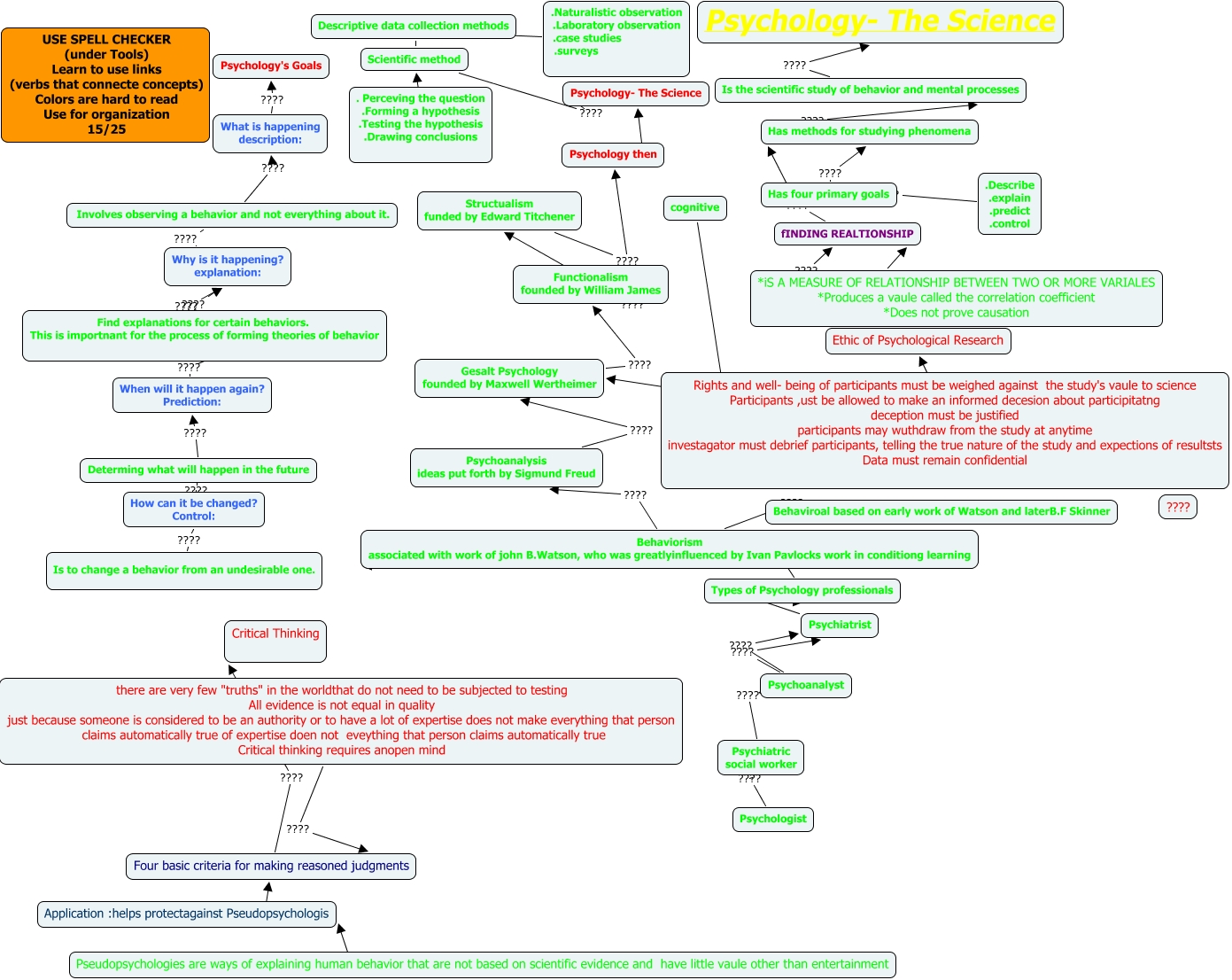 This Concept Map, created with IHMC CmapTools, has information related to: Carmichael ch1 15, .Describe .explain .predict .control ???? Has four primary goals, Determing what will happen in the future ???? When will it happen again? Prediction:, *iS A MEASURE OF RELATIONSHIP BETWEEN TWO OR MORE VARIALES *Produces a vaule called the correlation coefficient *Does not prove causation ???? fINDING REALTIONSHIP, Find explanations for certain behaviors. This is importnant for the process of forming theories of behavior ???? Why is it happening? explanation:, Application :helps protectagainst Pseudopsychologis ???? Four basic criteria for making reasoned judgments, Psychiatric social worker ???? Psychoanalyst, Is the scientific study of behavior and mental processes ???? Psychology- The Science, Has methods for studying phenomena ???? Is the scientific study of behavior and mental processes, Scientific method ???? Psychology- The Science, Psychoanalysis ideas put forth by Sigmund Freud ???? Gesalt Psychology founded by Maxwell Wertheimer, Psychology then ???? Psychology- The Science, When will it happen again? Prediction: ???? Find explanations for certain behaviors. This is importnant for the process of forming theories of behavior, Rights and well- being of participants must be weighed against the study's vaule to science Participants ,ust be allowed to make an informed decesion about participitatng deception must be justified participants may wuthdraw from the study at anytime investagator must debrief participants, telling the true nature of the study and expections of resultsts Data must remain confidential ???? Ethic of Psychological Research, How can it be changed? Control: ???? Determing what will happen in the future, Why is it happening? explanation: ???? Involves observing a behavior and not everything about it., Psychoanalyst ???? Psychiatrist, Behaviroal based on early work of Watson and laterB.F Skinner ???? Behaviorism associated with work of john B.Watson, who was greatlyinfluenced by Ivan Pavlocks work in conditiong learning, Descriptive data collection methods ???? Scientific method, Types of Psychology professionals Behaviorism associated with work of john B.Watson, who was greatlyinfluenced by Ivan Pavlocks work in conditiong learning, .Naturalistic observation .Laboratory observation .case studies .surveys ???? Descriptive data collection methods