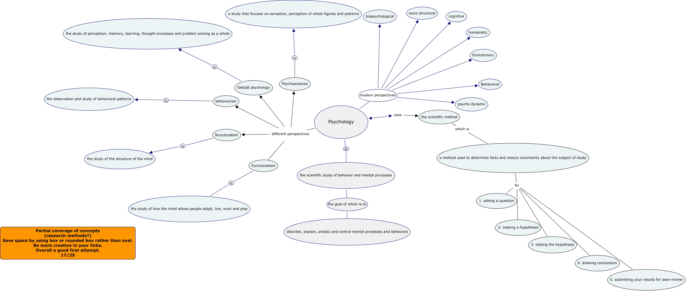 This Concept Map, created with IHMC CmapTools, has information related to: Zetterlund Ch 1 17, Psychology different perspectives behaviorism, a method used to determine facts and reduce uncertainty about the subject of study by 3. testing the hypothesis, Psychoanalysis is a study that focuses on sensation, perception of whole figures and patterns, a method used to determine facts and reduce uncertainty about the subject of study by 2. making a hypothesis, Psychology modern perspectives Behavioral, Psychology uses the scientific method, Psychology different perspectives Structuralism, behaviorism is the observation and study of behavioral patterns, Gestalt psychology is the study of perception, memory, learning, thought processes and problem solving as a whole, a method used to determine facts and reduce uncertainty about the subject of study by 5. submitting your results for peer-review, the scientific study of behavior and mental processes the goal of which is to describe, explain, predict and control mental processes and behaviors, Psychology modern perspectives socio structural, Psychology different perspectives Psychoanalysis, a method used to determine facts and reduce uncertainty about the subject of study by 4. drawing conclusions, Structuralism is the study of the structure of the mind, Psychology modern perspectives cognitive, a method used to determine facts and reduce uncertainty about the subject of study by 1. asking a question, Psychology different perspectives Functionalism, Psychology modern perspectives psycho dynamic, Psychology different perspectives Gestalt psychology