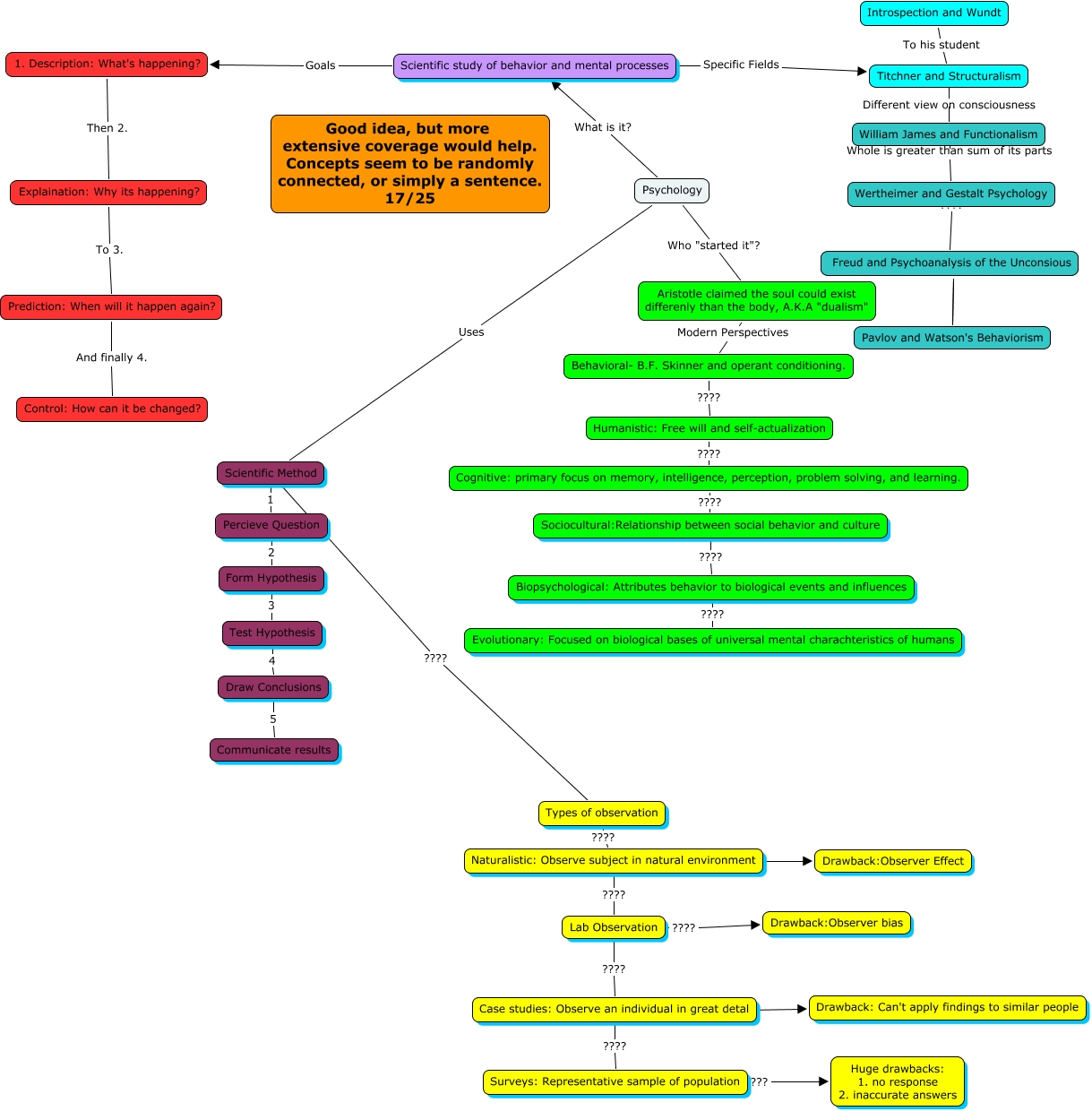 This Concept Map, created with IHMC CmapTools, has information related to: Shipp Ch 1 17, Lab Observation ???? Drawback:Observer bias, Form Hypothesis 3 Test Hypothesis, Titchner and Structuralism William James and Functionalism, Types of observation ???? Naturalistic: Observe subject in natural environment, Scientific Method ???? Types of observation, Scientific Method 1 Percieve Question, Psychology Uses Scientific Method, Introspection and Wundt To his student Titchner and Structuralism, Naturalistic: Observe subject in natural environment ???? Lab Observation, Surveys: Representative sample of population ???? Huge drawbacks: 1. no response 2. inaccurate answers, William James and Functionalism Whole is greater than sum of its parts Wertheimer and Gestalt Psychology, Biopsychological: Attributes behavior to biological events and influences ???? Evolutionary: Focused on biological bases of universal mental charachteristics of humans, Humanistic: Free will and self-actualization ???? Cognitive: primary focus on memory, intelligence, perception, problem solving, and learning., Wertheimer and Gestalt Psychology ???? Freud and Psychoanalysis of the Unconsious, Case studies: Observe an individual in great detal ???? Drawback: Can't apply findings to similar people, Behavioral- B.F. Skinner and operant conditioning. ???? Humanistic: Free will and self-actualization, Lab Observation ???? Case studies: Observe an individual in great detal, Sociocultural:Relationship between social behavior and culture ???? Biopsychological: Attributes behavior to biological events and influences, 1. Description: What's happening? Then 2. Explaination: Why its happening?, Aristotle claimed the soul could exist differenly than the body, A.K.A "dualism" Modern Perspectives Behavioral- B.F. Skinner and operant conditioning.