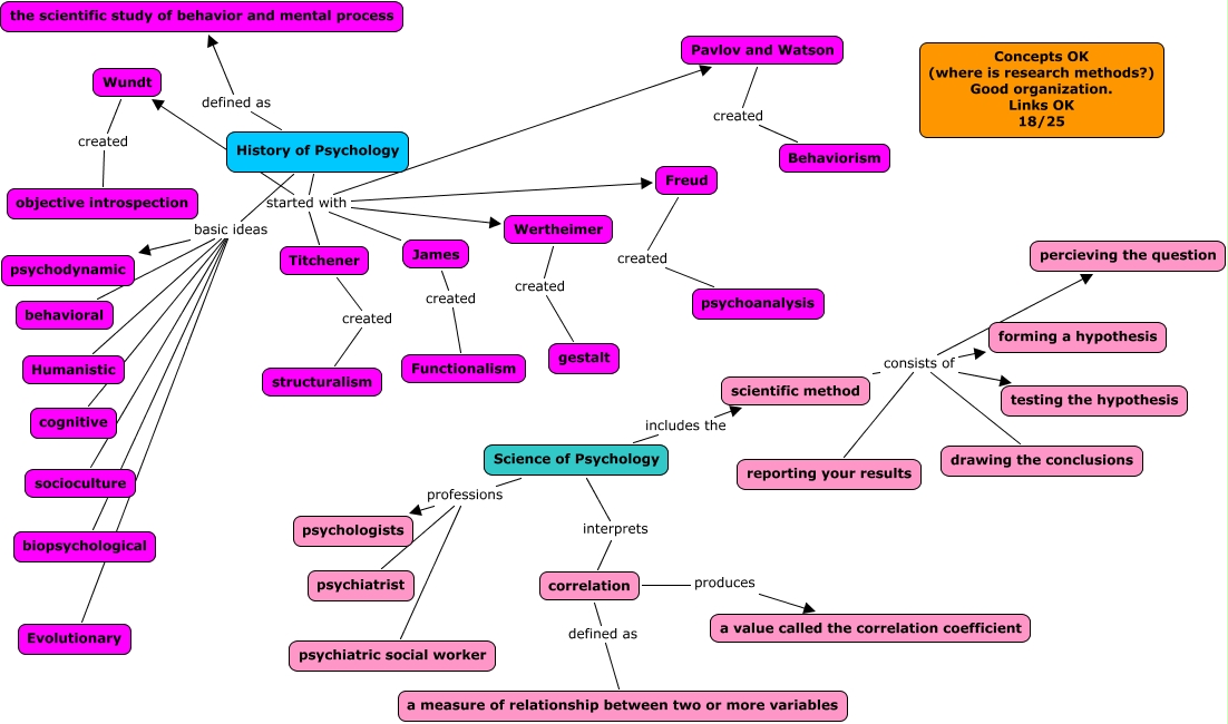 This Concept Map, created with IHMC CmapTools, has information related to: Hall Ch.1 18, History of Psychology basic ideas Humanistic, Freud created psychoanalysis, History of Psychology started with Pavlov and Watson, Science of Psychology professions psychologists, History of Psychology basic ideas biopsychological, Titchener created structuralism, History of Psychology started with Wertheimer, History of Psychology basic ideas behavioral, James created Functionalism, scientific method consists of testing the hypothesis, correlation defined as a measure of relationship between two or more variables, scientific method consists of percieving the question, Science of Psychology professions psychiatrist, scientific method consists of drawing the conclusions, Wundt created objective introspection, History of Psychology started with Freud, History of Psychology defined as the scientific study of behavior and mental process, History of Psychology basic ideas cognitive, History of Psychology started with Titchener, History of Psychology started with James