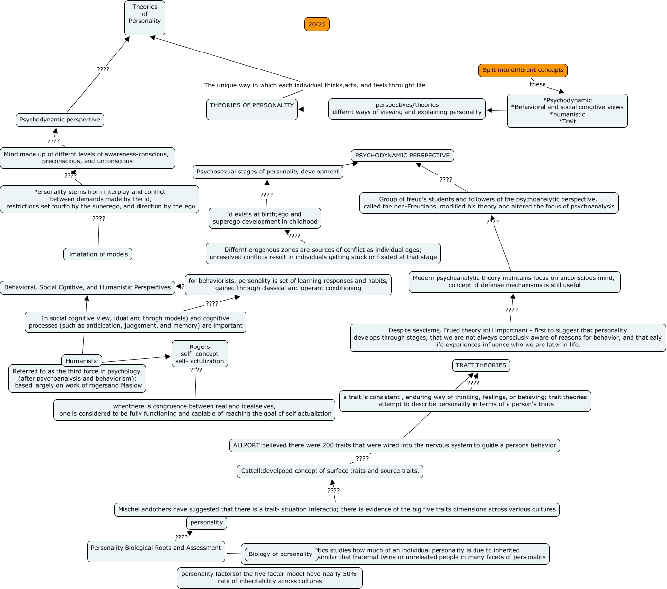 This Concept Map, created with IHMC CmapTools, has information related to: carmichael ch 13 20, Cattell:develpoed concept of surface traits and source traits. ???? ALLPORT:believed there were 200 traits that were wired into the nervous system to guide a persons behavior, imatation of models ???? Personality stems from interplay and conflict between demands made by the id, restrictions set fourth by the superego, and direction by the ego, THEORIES OF PERSONALITY The unique way in which each individual thinks,acts, and feels throught life Theories of Personality, Mind made up of differnt levels of awareness-conscious, preconscious, and unconscious ???? Psychodynamic perspective, Referred to as the third force in psychology (after psychoanalysis and behaviorism); based largely on work of rogersand Maslow ???? Rogers self- concept self- actulization, Biology of personality ???? Personality Biological Roots and Assessment, Split into different concepts these *Psychodynamic *Behavioral and social congitive views *humanistic *Trait, Personality Biological Roots and Assessment ???? personality, for behaviorists, personality is set of learning responses and habits, gained through classical and operant conditioning ???? Behavioral, Social Cgnitive, and Humanistic Perspectives, perspectives/theories differnt ways of viewing and explaining personality ???? THEORIES OF PERSONALITY, Humanistic Humanstic Behavioral, Social Cgnitive, and Humanistic Perspectives, Despite sevcisms, Frued theory still importnant - first to suggest that personality develops through stages, that we are not always consciusly aware of reasons for behavior, and that ealy life experiences influence who we are later in life. ???? Modern psychoanalytic theory maintains focus on unconscious mind, concept of defense mechanisms is still useful, whenthere is congruence between real and idealselves, one is considered to be fully functioning and caplable of reaching the goal of self actualiztion ???? Rogers self- concept self- actulization, a trait is consistent , enduring way of thinking, feelings, or behaving; trait theories attempt to describe personality in terms of a person's traits ???? TRAIT THEORIES, Group of freud's students and followers of the psychoanalytic perspective, called the neo-Freudians, modified his theory and altered the focus of psychoanalysis ???? PSYCHODYNAMIC PERSPECTIVE, Psychosexual stages of personality development ???? PSYCHODYNAMIC PERSPECTIVE, In social cognitive view, idual and throgh models) and cognitive processes (such as anticipation, judgement, and memory) are important ???? for behaviorists, personality is set of learning responses and habits, gained through classical and operant conditioning, Differnt erogenous zones are sources of conflict as individual ages; unresolved conflicts result in individuals getting stuck or fixated at that stage ???? Id exists at birth;ego and superego development in childhood, Modern psychoanalytic theory maintains focus on unconscious mind, concept of defense mechanisms is still useful ???? Group of freud's students and followers of the psychoanalytic perspective, called the neo-Freudians, modified his theory and altered the focus of psychoanalysis, Psychodynamic perspective ???? Theories of Personality