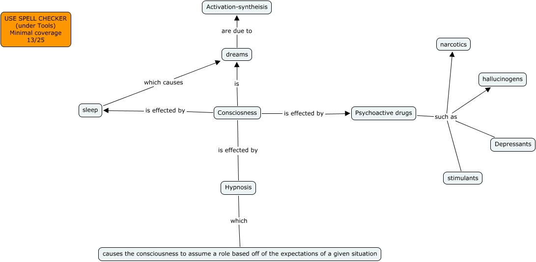 This Concept Map, created with IHMC CmapTools, has information related to: Zetterlund Ch 4 13, Psychoactive drugs such as hallucinogens, dreams are due to Activation-syntheisis, Consciosness is dreams, Psychoactive drugs such as narcotics, Consciosness is effected by sleep, Consciosness is effected by Hypnosis, Psychoactive drugs such as Depressants, sleep which causes dreams, Psychoactive drugs such as stimulants, Hypnosis which causes the consciousness to assume a role based off of the expectations of a given situation, Consciosness is effected by Psychoactive drugs