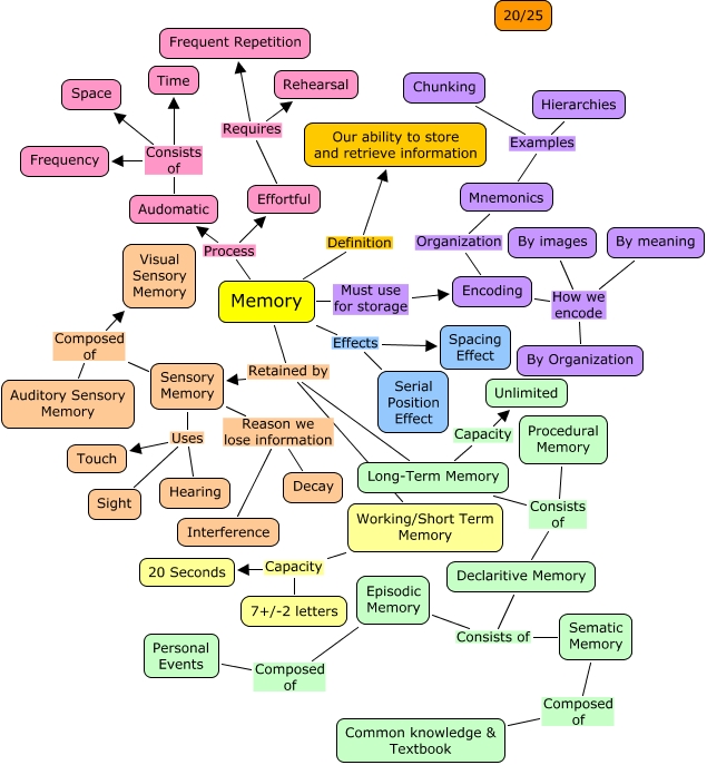 This Concept Map, created with IHMC CmapTools, has information related to: Simpson CH.6 20, Audomatic Consists of Frequency, Memory Retained by Sensory Memory, Memory Effects Serial Position Effect, Encoding How we encode By meaning, Sensory Memory Reason we lose information Interference, Memory Must use for storage Encoding, Audomatic Consists of Time, Memory Retained by Working/Short Term Memory, Memory Retained by Long-Term Memory, Memory Process Audomatic, Effortful Requires Rehearsal, Sensory Memory Uses Touch, Sematic Memory Composed of Common knowledge & Textbook, Mnemonics Examples Chunking, Working/Short Term Memory Capacity 7+/-2 letters, Declaritive Memory Consists of Episodic Memory, Declaritive Memory Consists of Sematic Memory, Memory Definition Our ability to store and retrieve information, Audomatic Consists of Space, Encoding How we encode By images