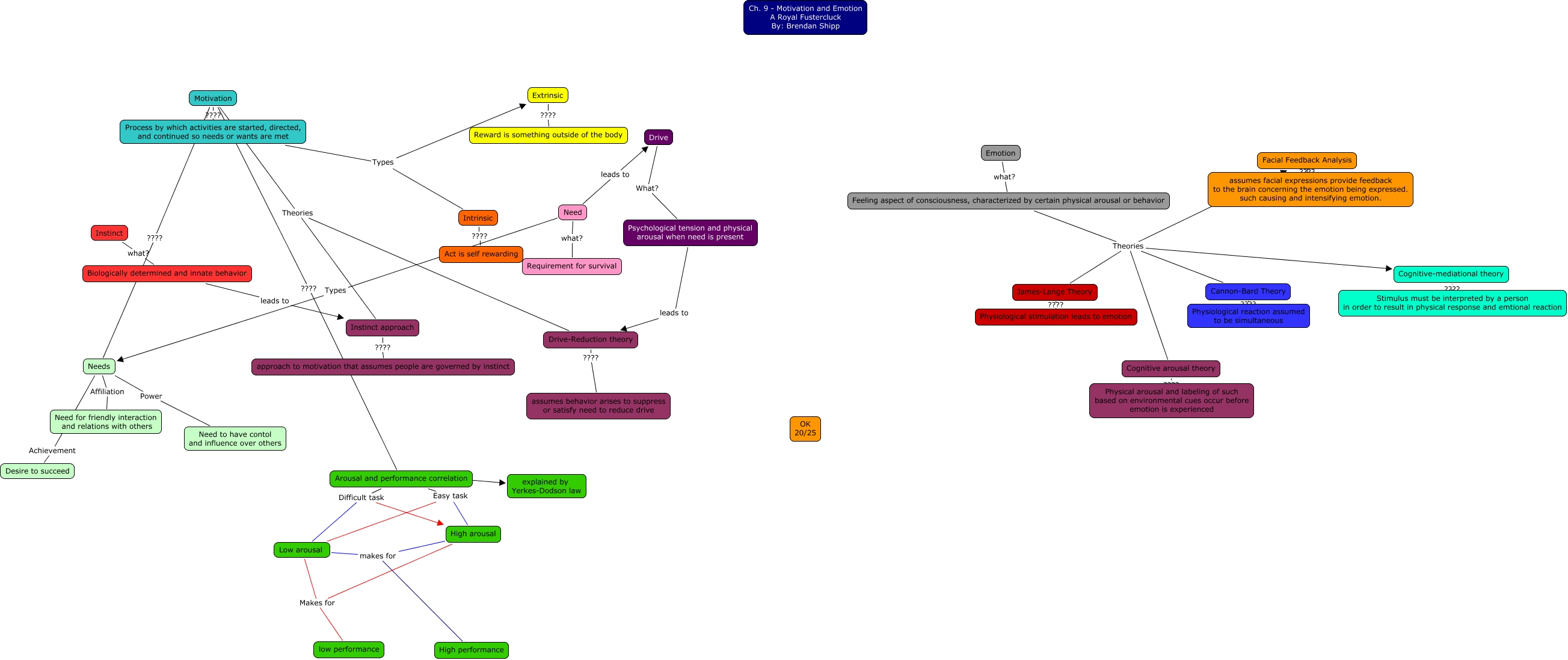 This Concept Map, created with IHMC CmapTools, has information related to: Shipp Ch 9 20, Drive What? Psychological tension and physical arousal when need is present, Intrinsic ???? Act is self rewarding, Arousal and performance correlation Easy task Low arousal, Need leads to Drive, Cognitive-mediational theory ???? Stimulus must be interpreted by a person in order to result in physical response and emtional reaction, Instinct what? Biologically determined and innate behavior, Low arousal Makes for low performance, Extrinsic ???? Reward is something outside of the body, Process by which activities are started, directed, and continued so needs or wants are met Types Extrinsic, Feeling aspect of consciousness, characterized by certain physical arousal or behavior Theories Facial Feedback Analysis, Motivation ???? Needs, Instinct approach ???? approach to motivation that assumes people are governed by instinct, Need Types Needs, Needs Power Need to have contol and influence over others, Biologically determined and innate behavior leads to Instinct approach, Arousal and performance correlation ???? explained by Yerkes-Dodson law, Feeling aspect of consciousness, characterized by certain physical arousal or behavior Theories Cognitive-mediational theory, Arousal and performance correlation Easy task High arousal, Cognitive arousal theory ???? Physical arousal and labeling of such based on environmental cues occur before emotion is experienced, James-Lange Theory ???? Physiological stimulation leads to emotion