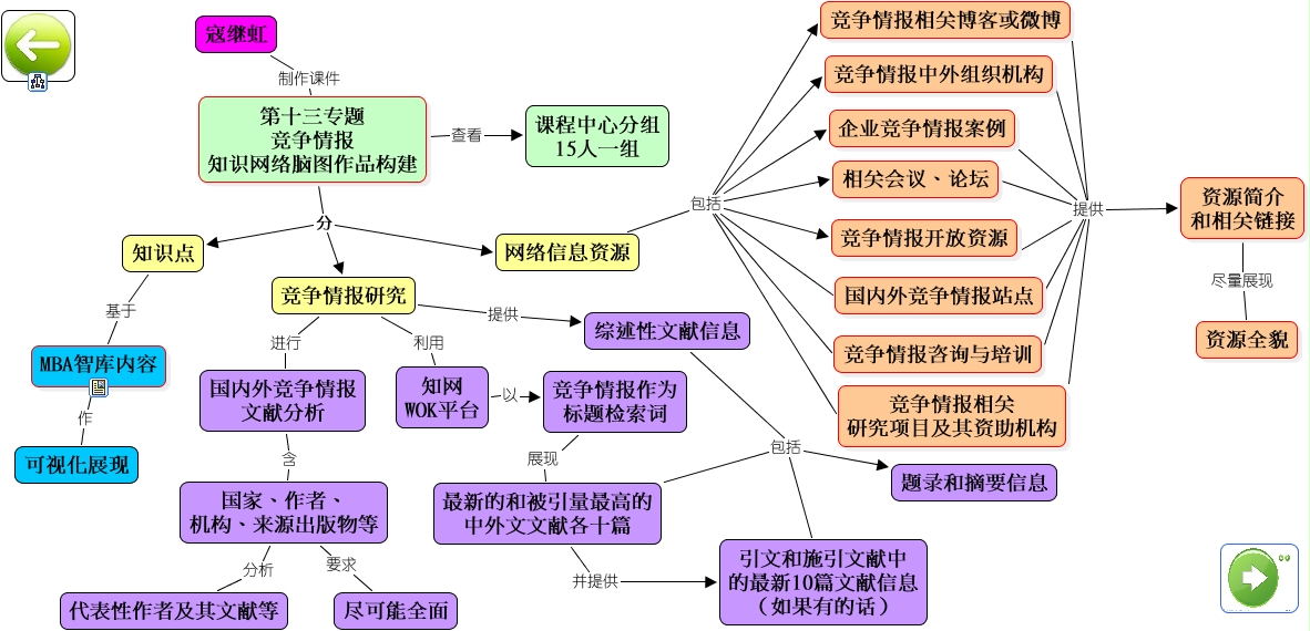 此概念图以 IHMC CmapTools 创建, 内含信息有关于: 竞争情报可视化知识网络构建, 国内外竞争情报站点 提供 资源简介 和相关链接, 网络信息资源 包括 竞争情报相关 研究项目及其资助机构, 竞争情报研究 利用 知网 WOK平台, 企业竞争情报案例 提供 资源简介 和相关链接, 竞争情报研究 提供 综述性文献信息, 竞争情报开放资源 提供 资源简介 和相关链接, 综述性文献信息 包括 题录和摘要信息, 第十三专题 竞争情报 知识网络脑图作品构建 分 网络信息资源, 第十三专题 竞争情报 知识网络脑图作品构建 查看 课程中心分组 15人一组, 竞争情报作为 标题检索词 展现 最新的和被引量最高的 中外文文献各十篇, 竞争情报相关博客或微博 提供 资源简介 和相关链接, 竞争情报咨询与培训 提供 资源简介 和相关链接, 国家、作者、 机构、来源出版物等 要求 尽可能全面, 寇继虹 制作课件 第十三专题 竞争情报 知识网络脑图作品构建, 国内外竞争情报 文献分析 含 国家、作者、 机构、来源出版物等, 第十三专题 竞争情报 知识网络脑图作品构建 分 竞争情报研究, 相关会议、论坛 提供 资源简介 和相关链接, 竞争情报研究 进行 国内外竞争情报 文献分析, 引文和施引文献中 的最新10篇文献信息 (如果有的话) 包括 题录和摘要信息, 网络信息资源 包括 竞争情报咨询与培训