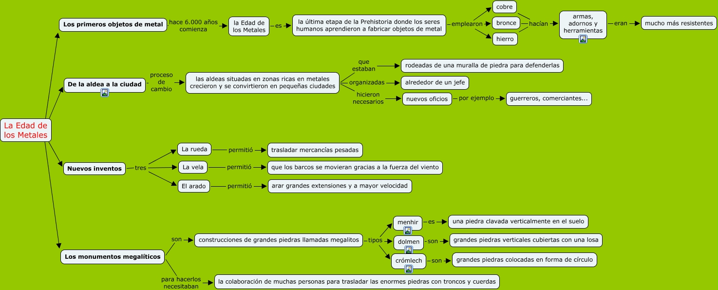 Este Cmap, tiene información relacionada con: La Edad de los Metales, construcciones de grandes piedras llamadas megalitos tipos menhir, La Edad de los Metales ???? De la aldea a la ciudad, las aldeas situadas en zonas ricas en metales crecieron y se convirtieron en pequeñas ciudades hicieron necesarios nuevos oficios, la última etapa de la Prehistoria donde los seres humanos aprendieron a fabricar objetos de metal emplearon bronce, La rueda permitió trasladar mercancías pesadas, construcciones de grandes piedras llamadas megalitos tipos dolmen, Nuevos inventos tres La vela, armas, adornos y herramientas eran mucho más resistentes, Nuevos inventos tres La rueda, Nuevos inventos tres El arado, Los monumentos megalíticos para hacerlos necesitaban la colaboración de muchas personas para trasladar las enormes piedras con troncos y cuerdas, bronce hacían armas, adornos y herramientas, las aldeas situadas en zonas ricas en metales crecieron y se convirtieron en pequeñas ciudades que estaban rodeadas de una muralla de piedra para defenderlas, la Edad de los Metales es la última etapa de la Prehistoria donde los seres humanos aprendieron a fabricar objetos de metal, menhir es una piedra clavada verticalmente en el suelo, Los primeros objetos de metal hace 6.000 años comienza la Edad de los Metales, La Edad de los Metales ???? Los monumentos megalíticos, cobre hacían armas, adornos y herramientas, nuevos oficios por ejemplo guerreros, comerciantes..., hierro hacían armas, adornos y herramientas