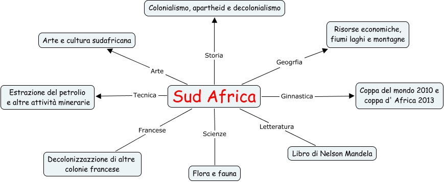 Questa Cmap, creata con IHMC CmapTools, contiene informazioni relative a: South Africa, Sud Africa Letteratura Libro di Nelson Mandela, Sud Africa Tecnica Estrazione del petrolio e altre attività minerarie, Sud Africa Ginnastica Coppa del mondo 2010 e coppa d' Africa 2013, Sud Africa Scienze Flora e fauna, Sud Africa Storia Colonialismo, apartheid e decolonialismo, Sud Africa Francese Decolonizzazzione di altre colonie francese, Sud Africa Arte Arte e cultura sudafricana, Sud Africa Geogrfia Risorse economiche, fiumi laghi e montagne