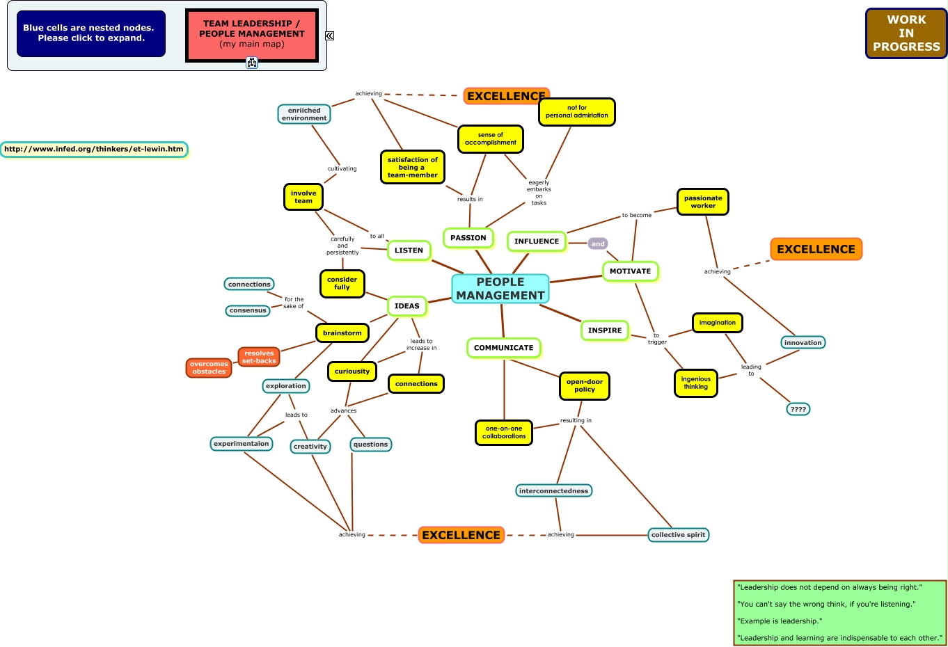 This Concept Map, created with IHMC CmapTools, has information related to: PEOPLE, imagination leading to ????, IDEAS brainstorm, collective spirit achieving EXCELLENCE, and MOTIVATE, open-door policy resulting in one-on-one collaborations, imagination leading to innovation, PEOPLE MANAGEMENT INFLUENCE, INSPIRE to trigger ingenious thinking, brainstorm resolves set-backs, enriiched environment achieving EXCELLENCE, PEOPLE MANAGEMENT IDEAS, ingenious thinking leading to innovation, ingenious thinking leading to ????, open-door policy resulting in interconnectedness, open-door policy resulting in collective spirit, passionate worker achieving EXCELLENCE, PEOPLE MANAGEMENT INSPIRE, IDEAS consider fully, PASSION eagerly embarks on tasks sense of accomplishment, IDEAS leads to increase in curiousity