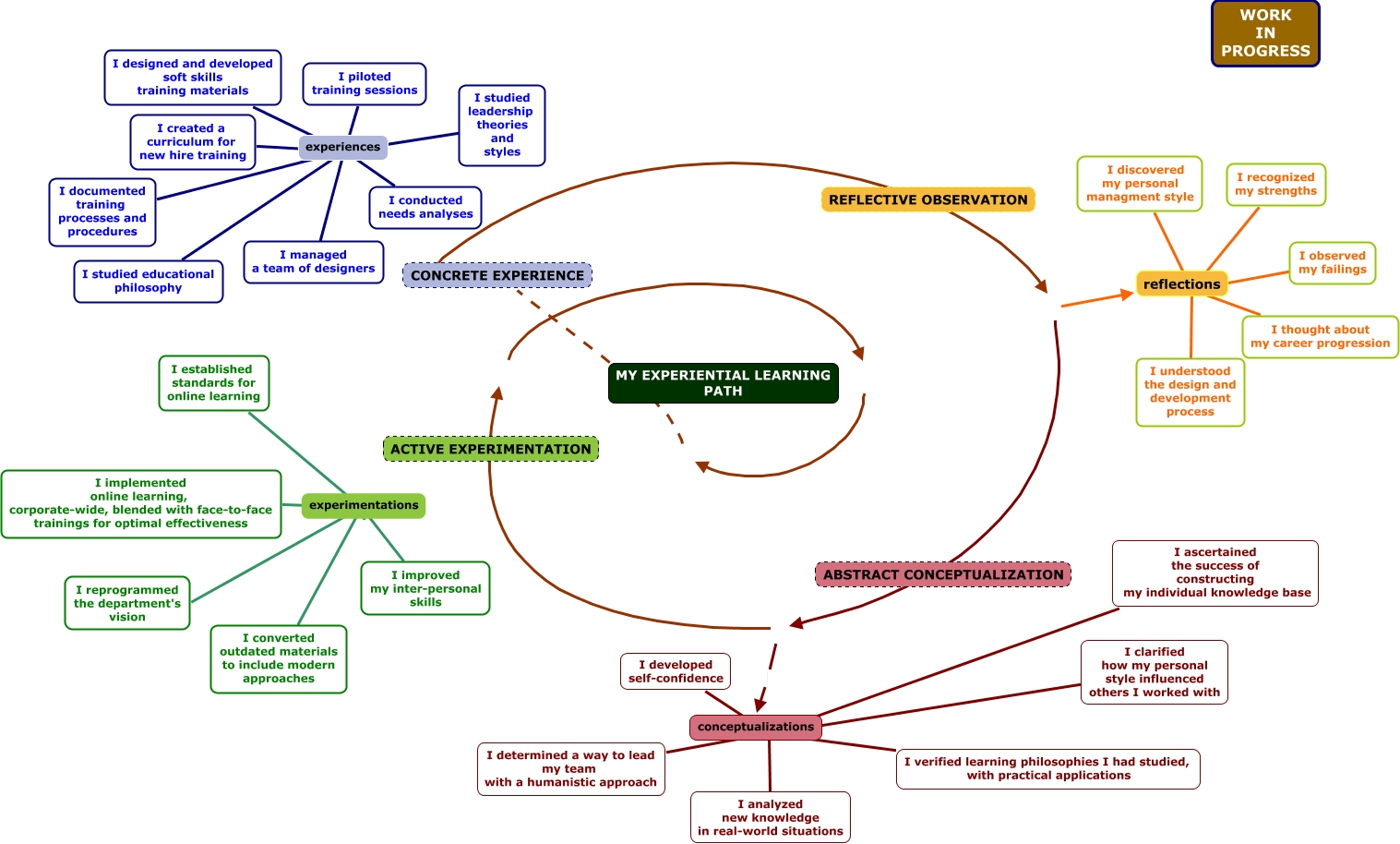 This Concept Map, created with IHMC CmapTools, has information related to: KOLB_overview_new, conceptualizations * I determined a way to lead my team with a humanistic approach, I documented training processes and procedures * I designed and developed soft skills training materials, reflections * I observed my failings, I studied leadership theories and styles * I conducted needs analyses, CONCRETE EXPERIENCE, conceptualizations * I analyzed new knowledge in real-world situations, experimentations * I improved my inter-personal skills, I studied leadership theories and styles * I studied educational philosophy, I documented training processes and procedures * I studied educational philosophy, reflections * I thought about my career progression, experiences * I studied educational philosophy, I managed a team of designers * I conducted needs analyses,, conceptualizations, I created a curriculum for new hire training * I designed and developed soft skills training materials, I documented training processes and procedures * I piloted training sessions, ????, experiences * I conducted needs analyses, I studied leadership theories and styles * I piloted training sessions, reflections * I understood the design and development process