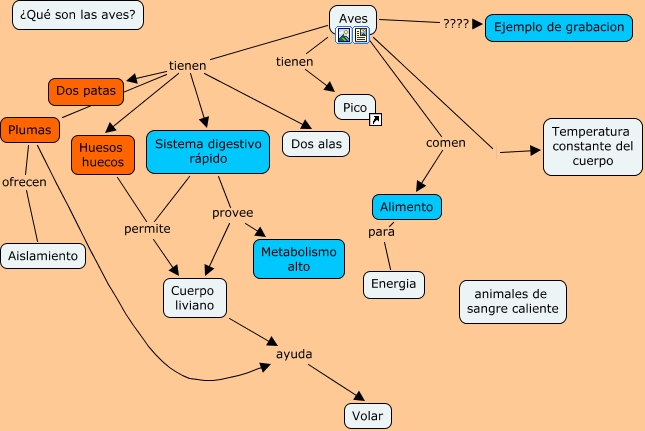 Este Cmap, tiene información relacionada con: Aves, Aves comen Alimento, Aves tienen Dos alas, Aves ???? Ejemplo de grabacion, Sistema digestivo rápido permite Cuerpo liviano, Sistema digestivo rápido provee Metabolismo alto, Alimento para Energia, Aves Temperatura constante del cuerpo, Huesos huecos permite Cuerpo liviano, Cuerpo liviano ayuda Volar, Sistema digestivo rápido provee Cuerpo liviano, Aves tienen Dos patas, Plumas ofrecen Aislamiento, Aves tienen Huesos huecos, Aves tienen Pico, Aves tienen Plumas, Aves tienen Sistema digestivo rápido, Plumas ayuda Volar