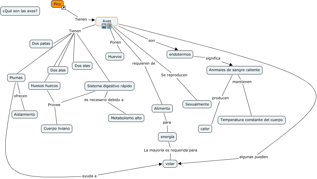 Este Cmap, tiene información relacionada con: Mapa Conceptual Aves, Aves Tienen Huesos huecos, Sistema digestivo rápido es necesario debido a Metabolismo alto, Aves Tienen Dos alas, Aves algunas pueden volar, energía La mayoría es requerida para volar, Huesos huecos Provee Cuerpo liviano, Plumas ofrecen Aislamiento, Aves Tienen Plumas, Pico Tienen Aves, Aves Tienen Dos patas, Plumas ayuda a volar, Alimento para energía, Aves Tienen Sistema digestivo rápido, Aves Tienen Dos alas, Sistema digestivo rápido Provee Cuerpo liviano, Animales de sangre caliente mantienen Temperatura constante del cuerpo, Aves son endotermos, Aves Se reproducen Sexualmente, endotermos significa Animales de sangre caliente, Animales de sangre caliente producen calor