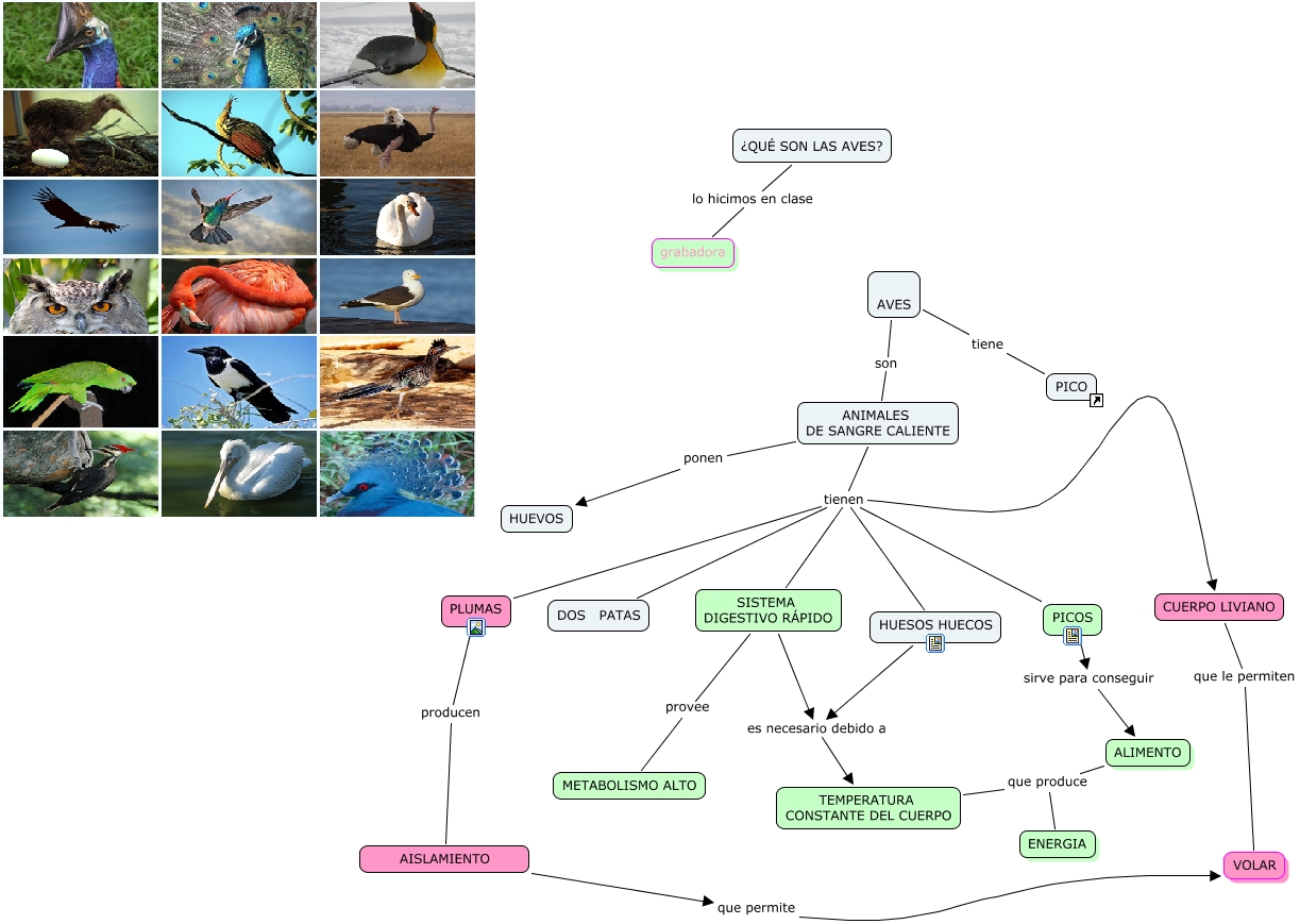 Este Cmap, tiene información relacionada con: aves, SISTEMA DIGESTIVO RÁPIDO es necesario debido a TEMPERATURA CONSTANTE DEL CUERPO, PLUMAS producen AISLAMIENTO, SISTEMA DIGESTIVO RÁPIDO provee METABOLISMO ALTO, ANIMALES DE SANGRE CALIENTE tienen SISTEMA DIGESTIVO RÁPIDO, ¿QUÉ SON LAS AVES? lo hicimos en clase grabadora, HUESOS HUECOS es necesario debido a TEMPERATURA CONSTANTE DEL CUERPO, ANIMALES DE SANGRE CALIENTE tienen HUESOS HUECOS, AVES son ANIMALES DE SANGRE CALIENTE, ALIMENTO que produce TEMPERATURA CONSTANTE DEL CUERPO, CUERPO LIVIANO que le permiten VOLAR, ANIMALES DE SANGRE CALIENTE tienen DOS PATAS, ANIMALES DE SANGRE CALIENTE tienen CUERPO LIVIANO, ALIMENTO que produce ENERGIA, ANIMALES DE SANGRE CALIENTE ponen HUEVOS, AISLAMIENTO que permite VOLAR, PICOS sirve para conseguir ALIMENTO, ANIMALES DE SANGRE CALIENTE tienen PLUMAS, ANIMALES DE SANGRE CALIENTE tienen PICOS, PICO tiene AVES