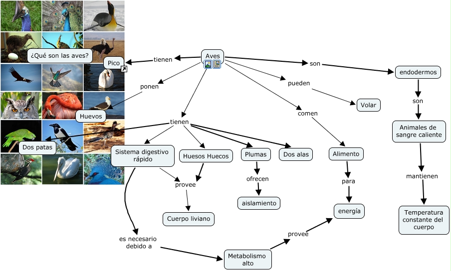 Este Cmap, tiene información relacionada con: Aves, Sistema digestivo rápido provee Cuerpo liviano, Aves tienen Plumas, Aves comen Alimento, Plumas ofrecen aislamiento, Animales de sangre caliente mantienen Temperatura constante del cuerpo, Aves tienen Pico, Aves ponen Huevos, Aves son endodermos, Aves tienen Huesos Huecos, Aves tienen Dos alas, Alimento para energía, Aves tienen Dos patas, Metabolismo alto provee energía, endodermos son Animales de sangre caliente, Aves tienen Sistema digestivo rápido, Aves pueden Volar, Huesos Huecos provee Cuerpo liviano, Sistema digestivo rápido es necesario debido a Metabolismo alto