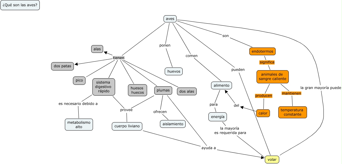 Este Cmap, tiene información relacionada con: Aves, aves tienen huesos huecos, aves ponen huevos, aves son endotermos, aves tienen pico, aves tienen sistema digestivo rápido, endotermos significa animales de sangre caliente, sistema digestivo rápido provee cuerpo liviano, plumas ayuda a volar, aves tienen plumas, aves tienen dos alas, cuerpo liviano ayuda a volar, plumas provee cuerpo liviano, aves tienen alas, aves tienen dos patas, sistema digestivo rápido es necesario debido a metabolismo alto, animales de sangre caliente producen calor, alimento para energía, energía la mayoría es requerida para volar, plumas ofrecen aislamiento, animales de sangre caliente mantienen temperatura constante