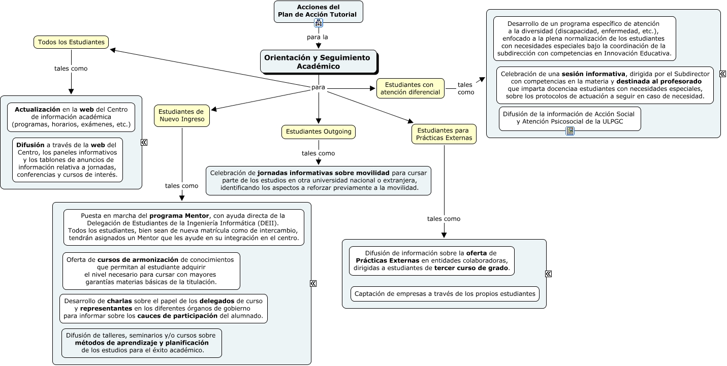 Este Cmap, tiene información relacionada con: PAT Acciones Seguimiento, Acciones del Plan de Acción Tutorial para la Orientación y Seguimiento Académico, Orientación y Seguimiento Académico para Todos los Estudiantes, Orientación y Seguimiento Académico para Estudiantes Outgoing, Todos los Estudiantes tales como ????, Orientación y Seguimiento Académico para Estudiantes con atención diferencial, Estudiantes con atención diferencial tales como ????, Estudiantes Outgoing tales como Celebración de jornadas informativas sobre movilidad para cursar parte de los estudios en otra universidad nacional o extranjera, identificando los aspectos a reforzar previamente a la movilidad., Estudiantes de Nuevo Ingreso tales como ????, Orientación y Seguimiento Académico para Estudiantes para Prácticas Externas, Orientación y Seguimiento Académico para Estudiantes de Nuevo Ingreso, Estudiantes para Prácticas Externas tales como ????