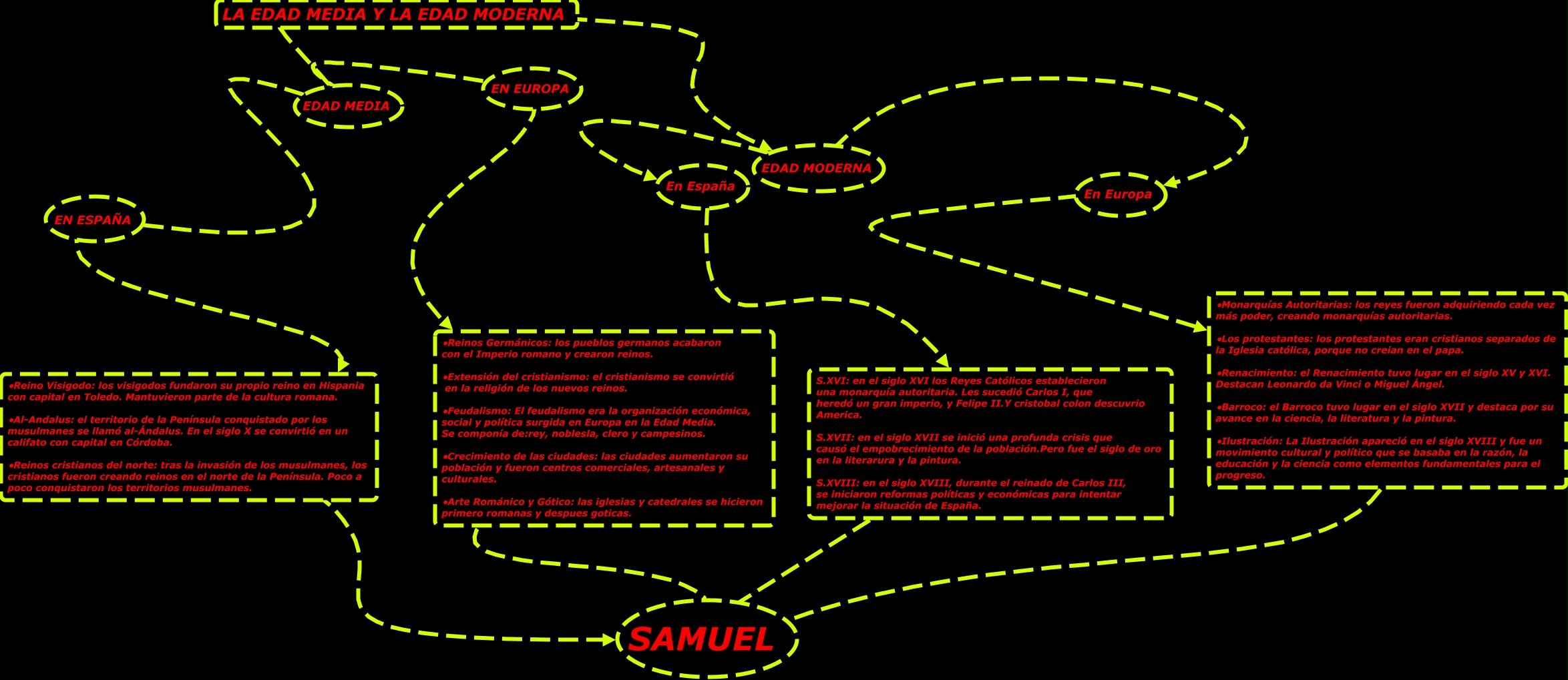 Este Cmap, tiene información relacionada con: SAMUEL, EN ESPAÑA ???? EDAD MEDIA, ∙Reinos Germánicos: los pueblos germanos acabaron con el Imperio romano y crearon reinos. ∙Extensión del cristianismo: el cristianismo se convirtió en la religión de los nuevos reinos. ∙Feudalismo: El feudalismo era la organización económica, social y política surgida en Europa en la Edad Media. Se componía de:rey, noblesla, clero y campesinos. ∙Crecimiento de las ciudades: las ciudades aumentaron su población y fueron centros comerciales, artesanales y culturales. ∙Arte Románico y Gótico: las iglesias y catedrales se hicieron primero romanas y despues goticas. ???? SAMUEL, EN ESPAÑA ???? ∙Reino Visigodo: los visigodos fundaron su propio reino en Hispania con capital en Toledo. Mantuvieron parte de la cultura romana. ∙Al-Andalus: el territorio de la Península conquistado por los musulmanes se llamó al-Ándalus. En el siglo X se convirtió en un califato con capital en Córdoba. ∙Reinos cristianos del norte: tras la invasión de los musulmanes, los cristianos fueron creando reinos en el norte de la Península. Poco a poco conquistaron los territorios musulmanes., En España ???? S.XVI: en el siglo XVI los Reyes Católicos establecieron una monarquía autoritaria. Les sucedió Carlos I, que heredó un gran imperio, y Felipe II.Y cristobal colon descuvrio America. S.XVII: en el siglo XVII se inició una profunda crisis que causó el empobrecimiento de la población.Pero fue el siglo de oro en la literarura y la pintura. S.XVIII: en el siglo XVIII, durante el reinado de Carlos III, se iniciaron reformas políticas y económicas para intentar mejorar la situación de España., ∙Reino Visigodo: los visigodos fundaron su propio reino en Hispania con capital en Toledo. Mantuvieron parte de la cultura romana. ∙Al-Andalus: el territorio de la Península conquistado por los musulmanes se llamó al-Ándalus. En el siglo X se convirtió en un califato con capital en Córdoba. ∙Reinos cristianos del norte: tras la invasión de los musulmanes, los cristianos fueron creando reinos en el norte de la Península. Poco a poco conquistaron los territorios musulmanes. ???? SAMUEL, En Europa ???? ∙Monarquías Autoritarias: los reyes fueron adquiriendo cada vez más poder, creando monarquías autoritarias. ∙Los protestantes: los protestantes eran cristianos separados de la Iglesia católica, porque no creian en el papa. ∙Renacimiento: el Renacimiento tuvo lugar en el siglo XV y XVI. Destacan Leonardo da Vinci o Miguel Ángel. ∙Barroco: el Barroco tuvo lugar en el siglo XVII y destaca por su avance en la ciencia, la literatura y la pintura. ∙Ilustración: La Ilustración apareció en el siglo XVIII y fue un movimiento cultural y político que se basaba en la razón, la educación y la ciencia como elementos fundamentales para el progreso., ∙Monarquías Autoritarias: los reyes fueron adquiriendo cada vez más poder, creando monarquías autoritarias. ∙Los protestantes: los protestantes eran cristianos separados de la Iglesia católica, porque no creian en el papa. ∙Renacimiento: el Renacimiento tuvo lugar en el siglo XV y XVI. Destacan Leonardo da Vinci o Miguel Ángel. ∙Barroco: el Barroco tuvo lugar en el siglo XVII y destaca por su avance en la ciencia, la literatura y la pintura. ∙Ilustración: La Ilustración apareció en el siglo XVIII y fue un movimiento cultural y político que se basaba en la razón, la educación y la ciencia como elementos fundamentales para el progreso. ???? SAMUEL, EDAD MEDIA ???? LA EDAD MEDIA Y LA EDAD MODERNA, LA EDAD MEDIA Y LA EDAD MODERNA ???? EDAD MODERNA, S.XVI: en el siglo XVI los Reyes Católicos establecieron una monarquía autoritaria. Les sucedió Carlos I, que heredó un gran imperio, y Felipe II.Y cristobal colon descuvrio America. S.XVII: en el siglo XVII se inició una profunda crisis que causó el empobrecimiento de la población.Pero fue el siglo de oro en la literarura y la pintura. S.XVIII: en el siglo XVIII, durante el reinado de Carlos III, se iniciaron reformas políticas y económicas para intentar mejorar la situación de España. ???? SAMUEL, EDAD MODERNA ???? En Europa, EN EUROPA ???? EDAD MEDIA, EDAD MODERNA ???? En España, EN EUROPA ???? ∙Reinos Germánicos: los pueblos germanos acabaron con el Imperio romano y crearon reinos. ∙Extensión del cristianismo: el cristianismo se convirtió en la religión de los nuevos reinos. ∙Feudalismo: El feudalismo era la organización económica, social y política surgida en Europa en la Edad Media. Se componía de:rey, noblesla, clero y campesinos. ∙Crecimiento de las ciudades: las ciudades aumentaron su población y fueron centros comerciales, artesanales y culturales. ∙Arte Románico y Gótico: las iglesias y catedrales se hicieron primero romanas y despues goticas.