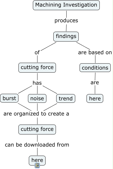 このコンセプトマップに関連する情報: cutting force, cutting force has noise, cutting force has trend, findings of cutting force, cutting force can be downloaded from here, burst are organized to create a cutting force, Machining Investigation produces findings, noise are organized to create a cutting force, cutting force has burst, conditions are here, findings are based on conditions, trend are organized to create a cutting force