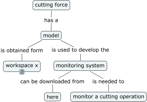 このコンセプトマップに関連する情報: cutting force cutting monitoring, model is used to develop the monitoring system, model is obtained form workspace x, monitoring system can be downloaded from here, cutting force has a model, monitoring system is needed to monitor a cutting operation