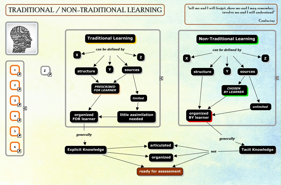 This Concept Map, created with IHMC CmapTools, has information related to: KM_part5, sources unlimited, unlimited organized BY learner, limited little assimilation needed, Traditional Learning can be defined by X, Explicit Knowledge organized, Non-Traditional Learning can be defined by structure, sources CHOSEN BY LEARNER, Non-Traditional Learning can be defined by X, PRESCRIBED FOR LEARNER organized FOR learner, sources PRESCRIBED FOR LEARNER, Traditional Learning can be defined by Z, Tacit Knowledge not organized, structure organized BY learner, Traditional Learning can be defined by Y, sources limited, Traditional Learning can be defined by structure, structure PRESCRIBED FOR LEARNER, Tacit Knowledge not articulated, CHOSEN BY LEARNER organized BY learner, little assimilation needed organized FOR learner