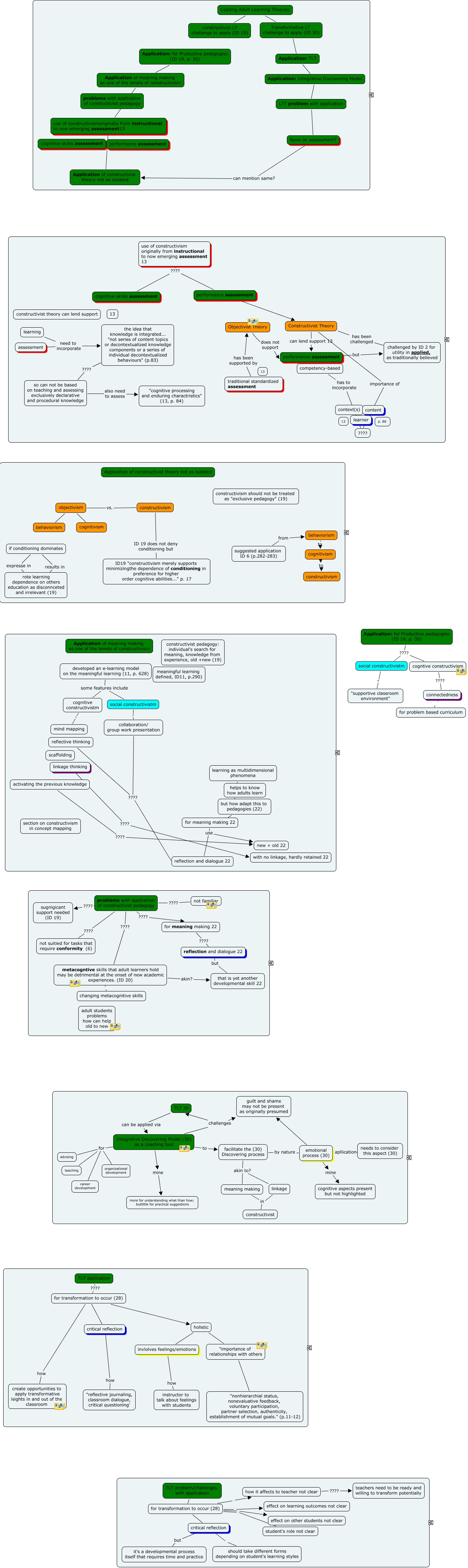 This Concept Map, created with IHMC CmapTools, has information related to: application of adult learning theories, holistic invlolves feelings/emotions, Objectivist Theory does not support performance assessment, the idea that knowledge is integrated... "not series of content topics or decontextualized knowledge components or a series of individual decontextualized behaviours" (p.83) ???? so can not be based on teaching and assessing exclusively declarative and procedural knowledge, so can not be based on teaching and assessing exclusively declarative and procedural knowledge also need to assess "cognitive processing and enduring charactristics" (13, p. 84), objectivism cognitivism, developed an e-learning model on the meaningful learning (11, p. 628) some features include social constructivistm, social constructivistm . collaboration/ group work presentation, constructivism ID 19 does not deny conditioning but ID19 "constructivism merely supports minimizingthe dependence of conditioning in preference for higher order cognitive abilities..." p. 17, problems with application of constructivist pedagogy ???? metacogntive skills that adult learners hold may be detrimental at the onset of new academic experiences. (ID 20), learning as multidimensional phenomena helps to know how adults learn, but how adapt this to pedagogies (22) for meaning making 22, for meaning making 22 use reflection and dialogue 22, for meaning making 22 use new + old 22, problems with application of constructivist pedagogy ???? for meaning making 22, metacogntive skills that adult learners hold may be detrimental at the onset of new academic experiences. (ID 20) akin? that is yet another developmental skill 22, use of constructivism originally from instructional to now emerging assessment 13 ???? performance assessment, challenged by ID 2 for utility in applied, as traditionally believed has been challenged Constructivist Theory, connectedness for problem based curriculum, Leading Adult Learning Theories constructivist LT challange to apply (ID 19), Application: for Productive pedagogies (ID 19, p. 35) Application of meaning making as one of the tenets of constructivism