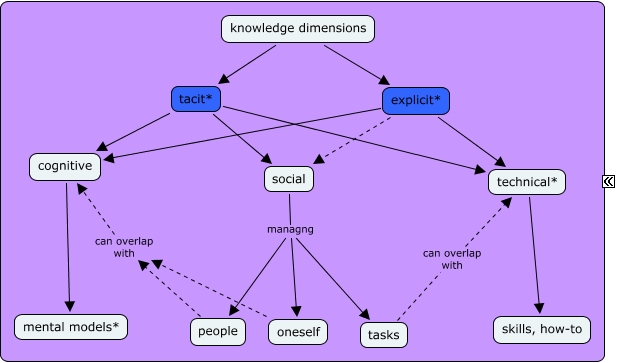 This Concept Map, created with IHMC CmapTools, has information related to: KM part, technical* skills, how-to, explicit* cognitive, tacit* social, explicit* technical*, tacit* cognitive, knowledge dimensions tacit*, explicit* social, tasks can overlap with technical*, tacit* technical*, knowledge dimensions explicit*, social managng people, cognitive mental models*, social managng oneself, oneself can overlap with cognitive, social managng tasks, people can overlap with cognitive