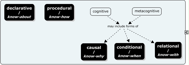 This Concept Map, created with IHMC CmapTools, has information related to: KM another part, metacognitive may include forms of relational / know-with, metacognitive may include forms of conditional / know-when, cognitive may include forms of conditional / know-when, metacognitive may include forms of causal / know-why, cognitive may include forms of relational / know-with, cognitive may include forms of causal / know-why