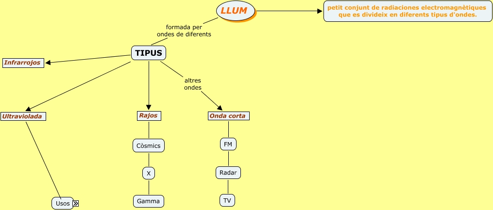 Este Cmap, tiene información relacionada con: Llum, Còsmics X, FM Radar, TIPUS altres ondes Onda corta, TIPUS Ultraviolada, TIPUS Infrarrojos, Rajos Còsmics, Radar TV, autenticar bitllets, LLUM petit conjunt de radiaciones electromagnètiques que es divideix en diferents tipus d'ondes., Ultraviolada s'utilitza en paranys, Onda corta FM, Ultraviolada s'utilitza en autenticar, X Gamma, paranys per caçar insectes, autenticar documents, TIPUS Rajos, LLUM formada per ondes de diferents TIPUS