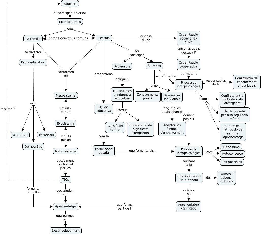 Este Cmap, tiene información relacionada con: PAC 3, Diferències individuals degut a les quals s'han d' Adaptar les formes d'ensenyament, Processos intrapsicològics com Autoconcepte, Processos intrapsicològics com Autoestima, L'escola on participen Alumnes, Mecanismes d'influència educativa com la Construcció de significats compartits, L'escola proporciona Ajuda educativa, Estils educatius com Democràtic, Processos intrapsicològics arribant a la Interiorització i ús autònom, Organització cooperativa permetent Processos interpsicològics, Alumnes amb Diferències individuals, Processos interpsicològics responsables de la Construcció del coneixement entre iguals, L'escola disposa d'una Organització social a les aules, TICs faciliten l' Educació, Alumnes experimenten Processos interpsicològics, Educació hi participen diversos Microsistemes, Processos intrapsicològics com Jos possibles, Microsistemes com La família, Processos interpsicològics donant pas als Processos intrapsicològics, Processos interpsicològics com Suport en l'atribució de sentit a l'aprenentatge, Organització social a les aules entre les quals destaca l' Organització cooperativa