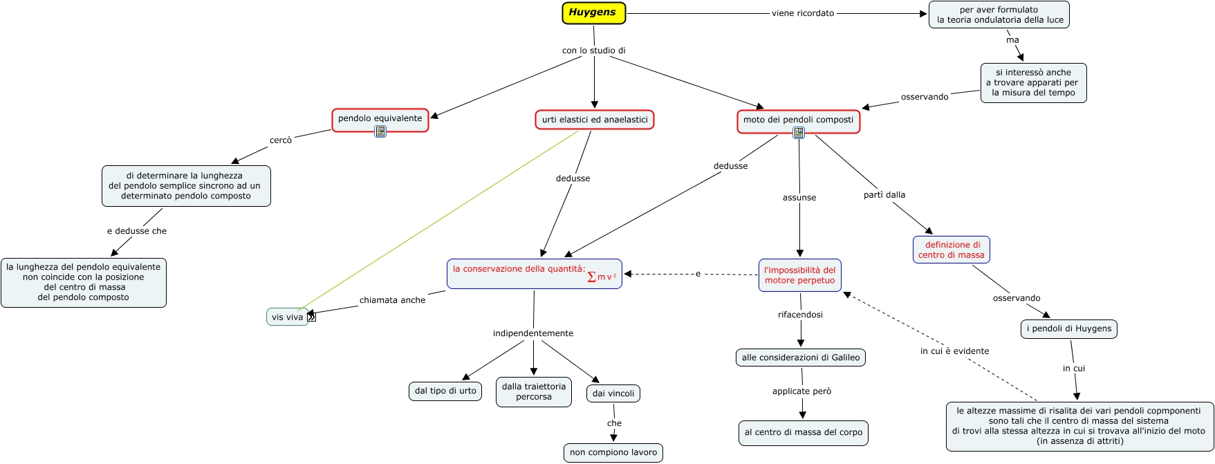 </mtext> <mrow> <sum/> <mtext> m </mtext> <mmultiscripts> <mtext> v </mtext> <none/> <mtext> 2 </mtext> </mmultiscripts> </mrow> </math> chiamata anche vis (forza) viva, forza morta riconducibile al moderno concetto di energia potenziale, l'impossibilità del motore perpetuo rifacendosi alle considerazioni di Galileo, le altezze massime di risalita dei vari pendoli copmponenti sono tali che il centro di massa del sistema di trovi alla stessa altezza in cui si trovava all'inizio del moto (in assenza di attriti) in cui è evidente l'impossibilità del motore perpetuo, vis (forza) viva contrapposta a forza morta, alle considerazioni di Galileo applicate però al centro di massa del corpo, moto dei pendoli composti assunse l'impossibilità del motore perpetuo, Huygens viene ricordato per aver formulato la teoria ondulatoria della luce, i pendoli di Huygens in cui le altezze massime di risalita dei vari pendoli copmponenti sono tali che il centro di massa del sistema di trovi alla stessa altezza in cui si trovava all'inizio del moto (in assenza di attriti), per aver formulato la teoria ondulatoria della luce ma si interessò anche a trovare apparati per la misura del tempo, <math xmlns="http://www.w3.org/1998/Math/MathML"> <mtext> la conservazione della quantità: