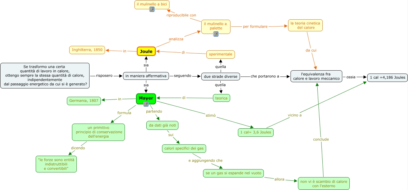 Questa Cmap, creata con IHMC CmapTools, contiene informazioni relative a: Joule e Mayer, Joule in Inghilterra, 1850, da dati già noti sui calori specifici dei gas, un primitivo principio di conservazione dell'energia dicendo "le forze sono entità indistruttibili e convertibili", Mayer partendo da dati già noti, il mulinello a palette riproducibile con il mulinello a bici, se un gas si espande nel vuoto allora non vi è scambio di calore con l'esterno, Mayer in Germania, 1807, in maniera affermativa seguendo due strade diverse, in maniera affermativa sia Mayer, calori specifici dei gas e aggiungendo che se un gas si espande nel vuoto, la teoria cinetica del calore da cui l'equivalenza fra calore e lavoro meccanico, 1 cal= 3,6 Joules vicino a 1 cal =4,186 Joules, teorica di Mayer, Se trasformo una certa quantità di lavoro in calore, ottengo sempre la stessa quantità di calore, indipendentemente dal passaggio energetico da cui si è generato? risposero in maniera affermativa, non vi è scambio di calore con l'esterno conclude l'equivalenza fra calore e lavoro meccanico, due strade diverse quella teorica, due strade diverse quella sperimentale, due strade diverse che portarono a l'equivalenza fra calore e lavoro meccanico, sperimentale di Joule, in maniera affermativa sia Joule