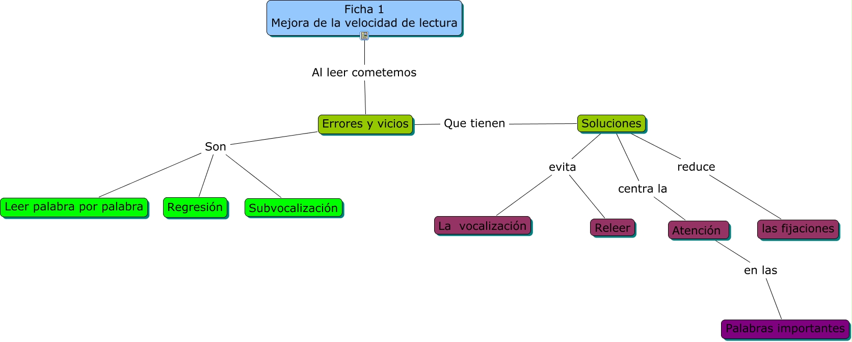Este Cmap, tiene información relacionada con: ficha 1, Leer palabra por palabra Son Regresión, Soluciones evita Releer, Errores y vicios Que tienen Soluciones, Errores y vicios Son Regresión, Atención en las Palabras importantes, Soluciones reduce las fijaciones, Subvocalización Son Regresión, Soluciones evita La vocalización, Ficha 1 Mejora de la velocidad de lectura Al leer cometemos Errores y vicios, Soluciones centra la Atención