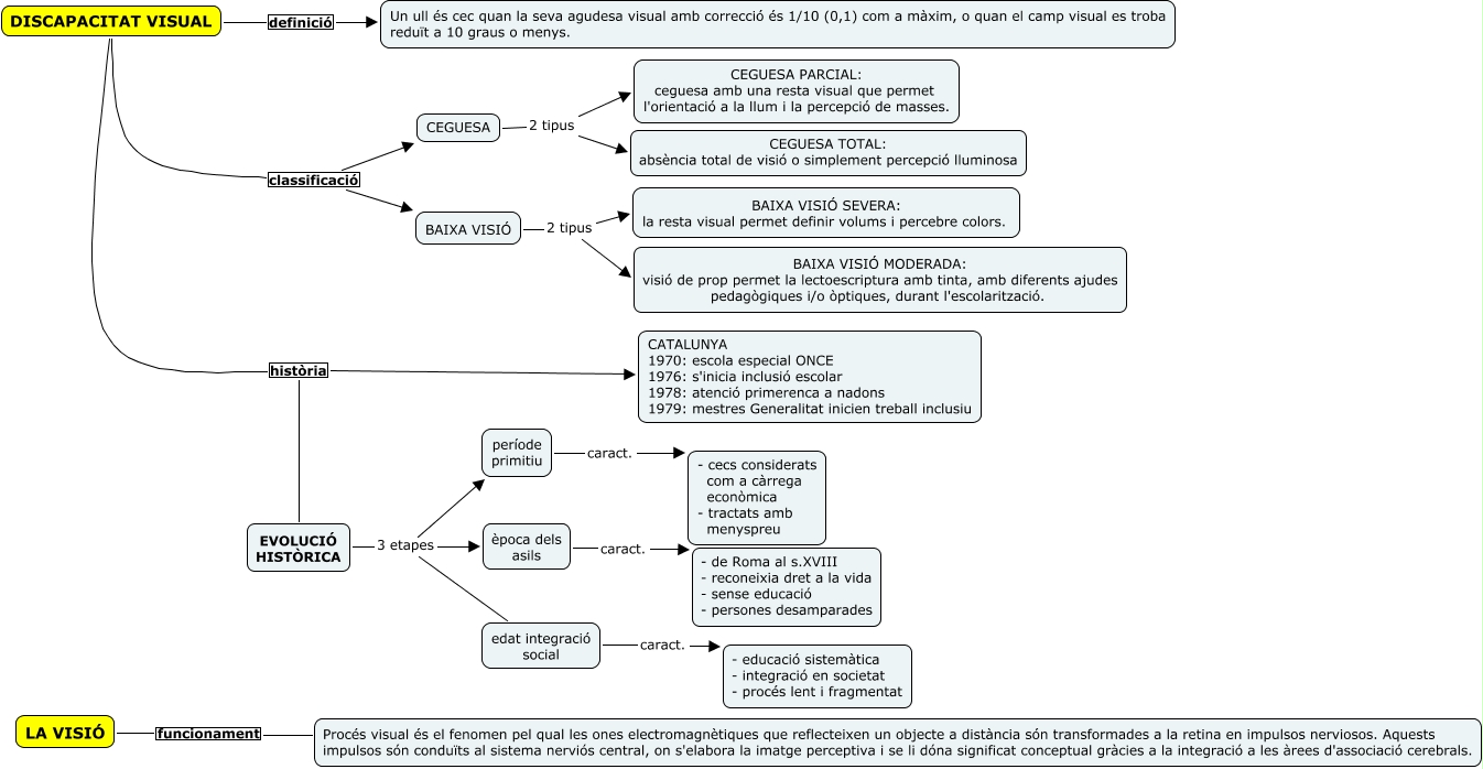 Este Cmap, tiene información relacionada con: La discapacitat visual, Procés visual és el fenomen pel qual les ones electromagnètiques que reflecteixen un objecte a distància són transformades a la retina en impulsos nerviosos. Aquests impulsos són conduïts al sistema nerviós central, on s'elabora la imatge perceptiva i se li dóna significat conceptual gràcies a la integració a les àrees d'associació cerebrals. funcionament LA VISIÓ, EVOLUCIÓ HISTÒRICA 3 etapes edat integració social, DISCAPACITAT VISUAL història EVOLUCIÓ HISTÒRICA, època dels asils caract. - de Roma al s.XVIII - reconeixia dret a la vida - sense educació - persones desamparades, DISCAPACITAT VISUAL classificació BAIXA VISIÓ, BAIXA VISIÓ 2 tipus BAIXA VISIÓ MODERADA: visió de prop permet la lectoescriptura amb tinta, amb diferents ajudes pedagògiques i/o òptiques, durant l'escolarització., EVOLUCIÓ HISTÒRICA 3 etapes època dels asils, EVOLUCIÓ HISTÒRICA 3 etapes període primitiu, CEGUESA 2 tipus CEGUESA TOTAL: absència total de visió o simplement percepció lluminosa, edat integració social caract. - educació sistemàtica - integració en societat - procés lent i fragmentat, DISCAPACITAT VISUAL definició Un ull és cec quan la seva agudesa visual amb correcció és 1/10 (0,1) com a màxim, o quan el camp visual es troba reduït a 10 graus o menys., CEGUESA 2 tipus CEGUESA PARCIAL: ceguesa amb una resta visual que permet l'orientació a la llum i la percepció de masses., DISCAPACITAT VISUAL història CATALUNYA 1970: escola especial ONCE 1976: s'inicia inclusió escolar 1978: atenció primerenca a nadons 1979: mestres Generalitat inicien treball inclusiu, DISCAPACITAT VISUAL classificació CEGUESA, període primitiu caract. - cecs considerats com a càrrega econòmica - tractats amb menyspreu, BAIXA VISIÓ 2 tipus BAIXA VISIÓ SEVERA: la resta visual permet definir volums i percebre colors.